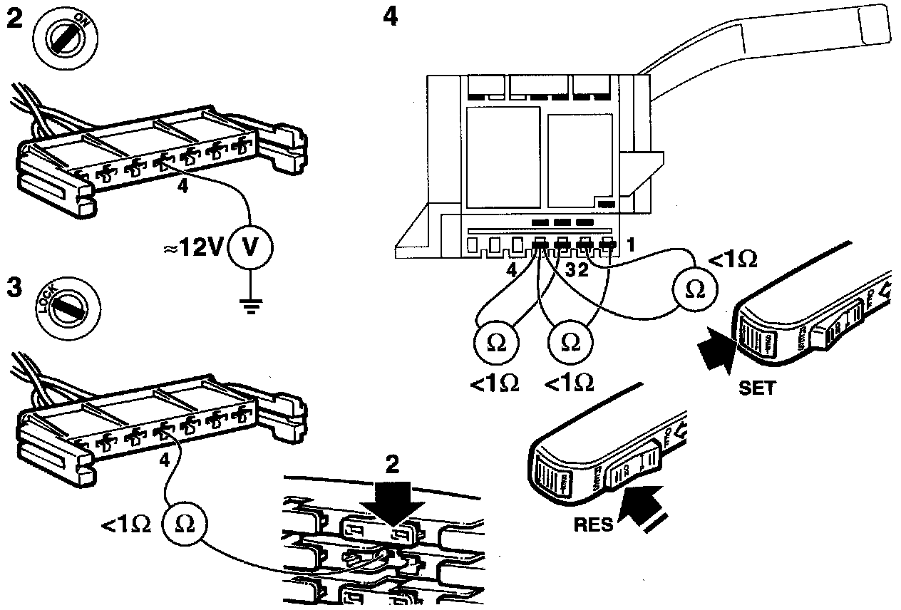 4 Check the switch by holding it in the RESUME position and measuring the resistance across pins 4 and 3 and pins 4 and 1.