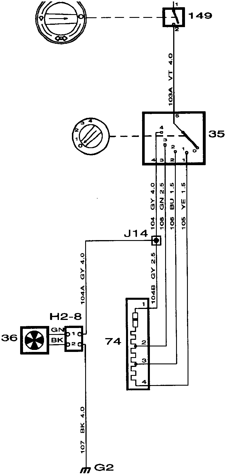 Current is supplied from fuse 6 to main fan switch 149 and on to ventilation fan switch 35. The main switch is controlled by the air distribution control and breaks the circuit when the control is in position 0.