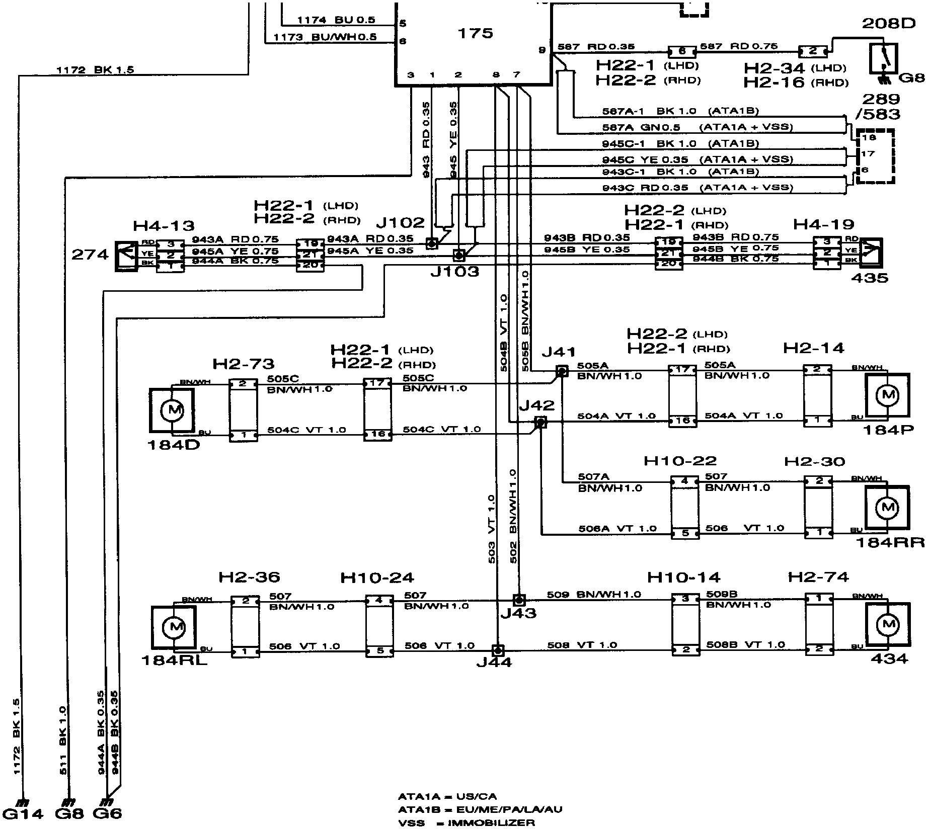 When the doors are locked, terminal 2 of the control module is grounded and current is supplied for 0.7 seconds to all actuating motors, closing the locks. The motors are grounded via terminal 8.