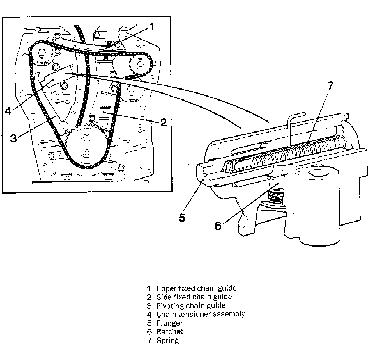 When the engine is running, pressurized engine oil acts in the opposite direction to the spring to control the force applied by the tensioner to the chain. This control of the tensioning force minimizes the noise from the chain. There are two fixed chain guides and one pivoting one, controlled by the chain tensioner.