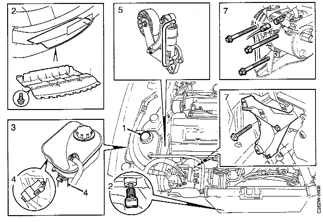 5. Pull hard on the multigroove belt and lock the belt tensioner using tool 83 94 488, or equivalent. Remove the belt from the A/C compressor and coolant pump pulleys.