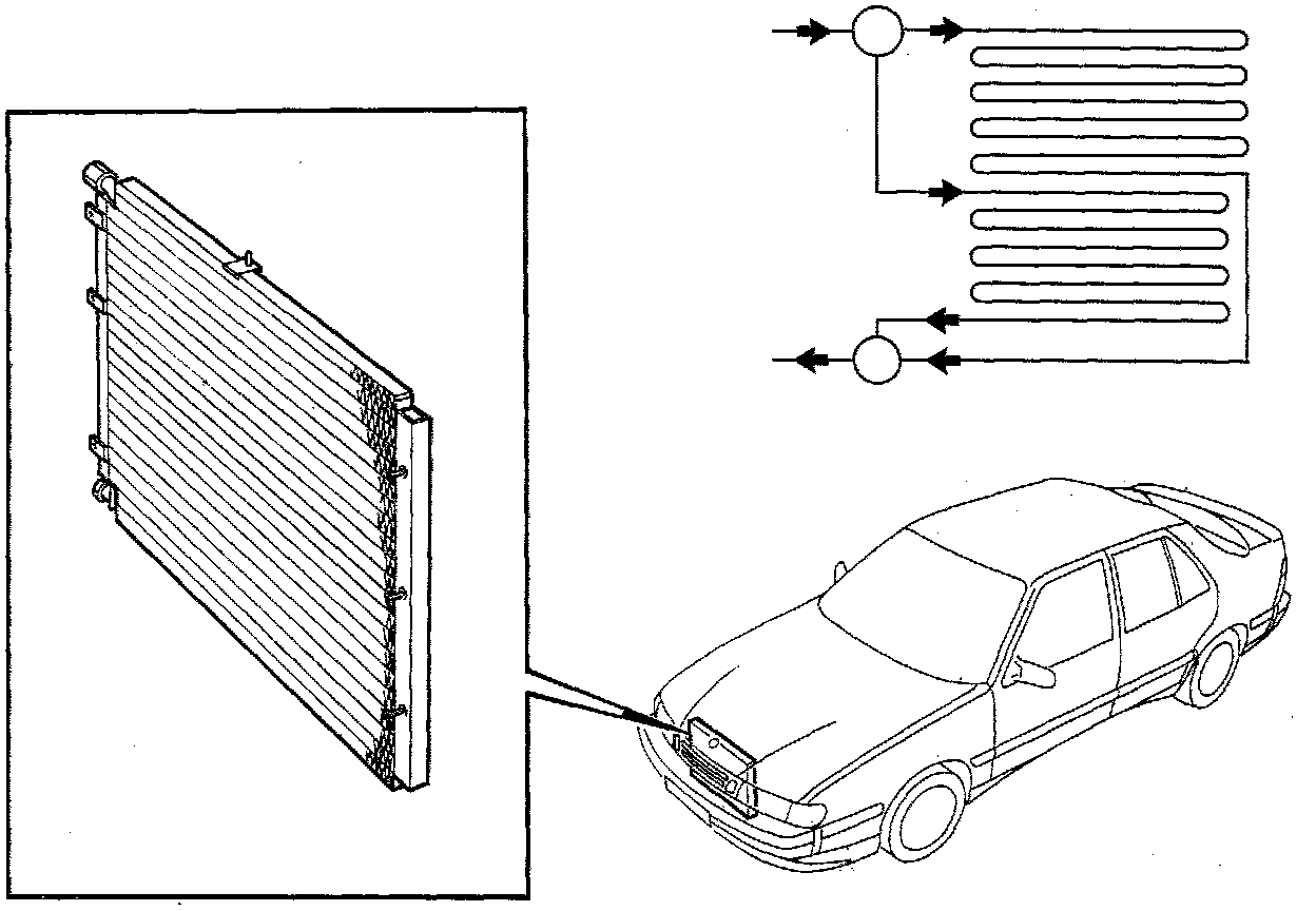 The hot refrigerant at high pressure is pumped by the compressor in to the condenser's cooling coil. The cooling coil fins, which are cooled by air from the car's radiator fan and the natural air circulation through the car. As heat always moves from a warmer to a cooler object, the hot refrigerant will transfer a part of its heat to the colder air. When the hot gaseous refrigerant looses some of its heat, it starts to condense and return to liquid form.