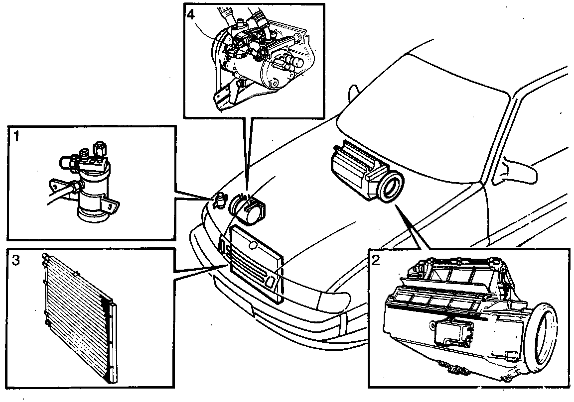 In order for the medium to boil, heat must be available. This heat is taken from the air around the evaporator in which boiling takes place. When heat is absorbed by the refrigerant, the surrounding air becomes colder. It is this cold air which is blown into the cabin by the heating and ventilation unit fan. The heat which is absorbed by the refrigerant in the evaporator is. transported to the engine compartment where it is transferred to the air by a condenser which is cooled by the air blowing through it and/or the electric radiator fan.