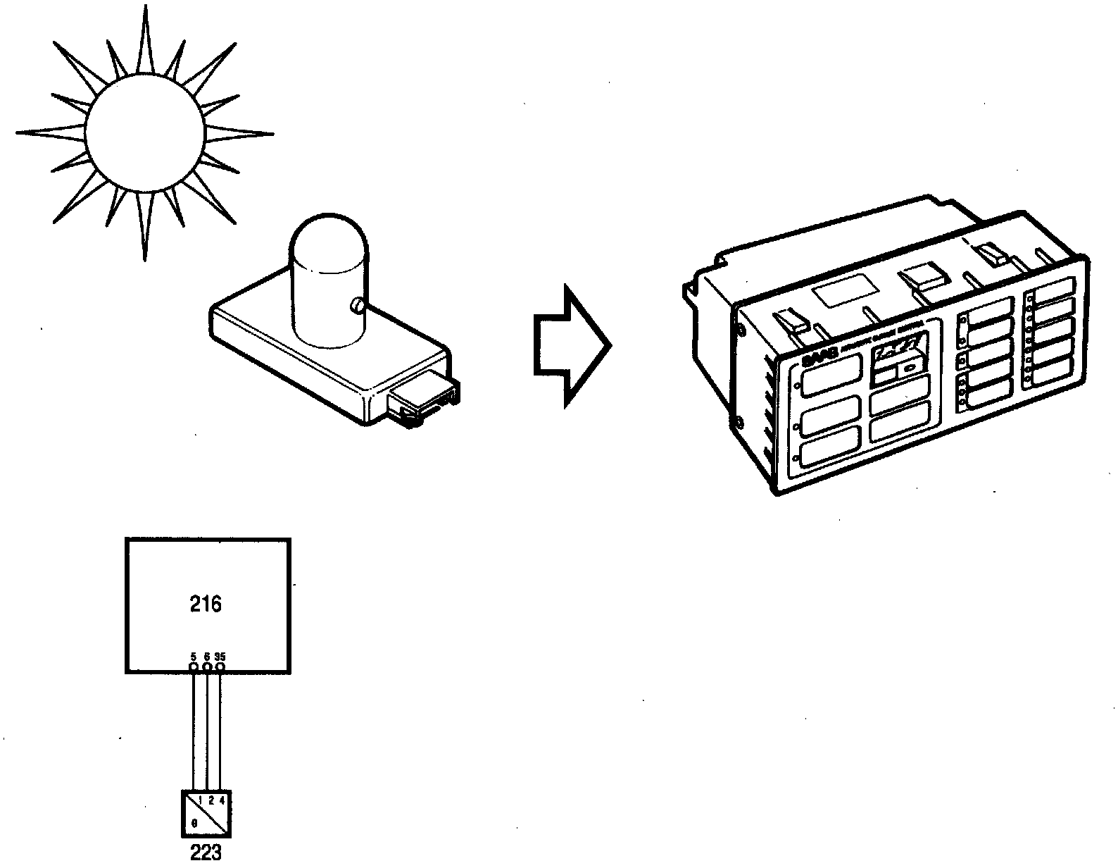 The solar sensor is located on the top of the facia. It registers solar intensity but also height and azimuth through the windscreen. In older year models (-1989), only solar intensity is measured.