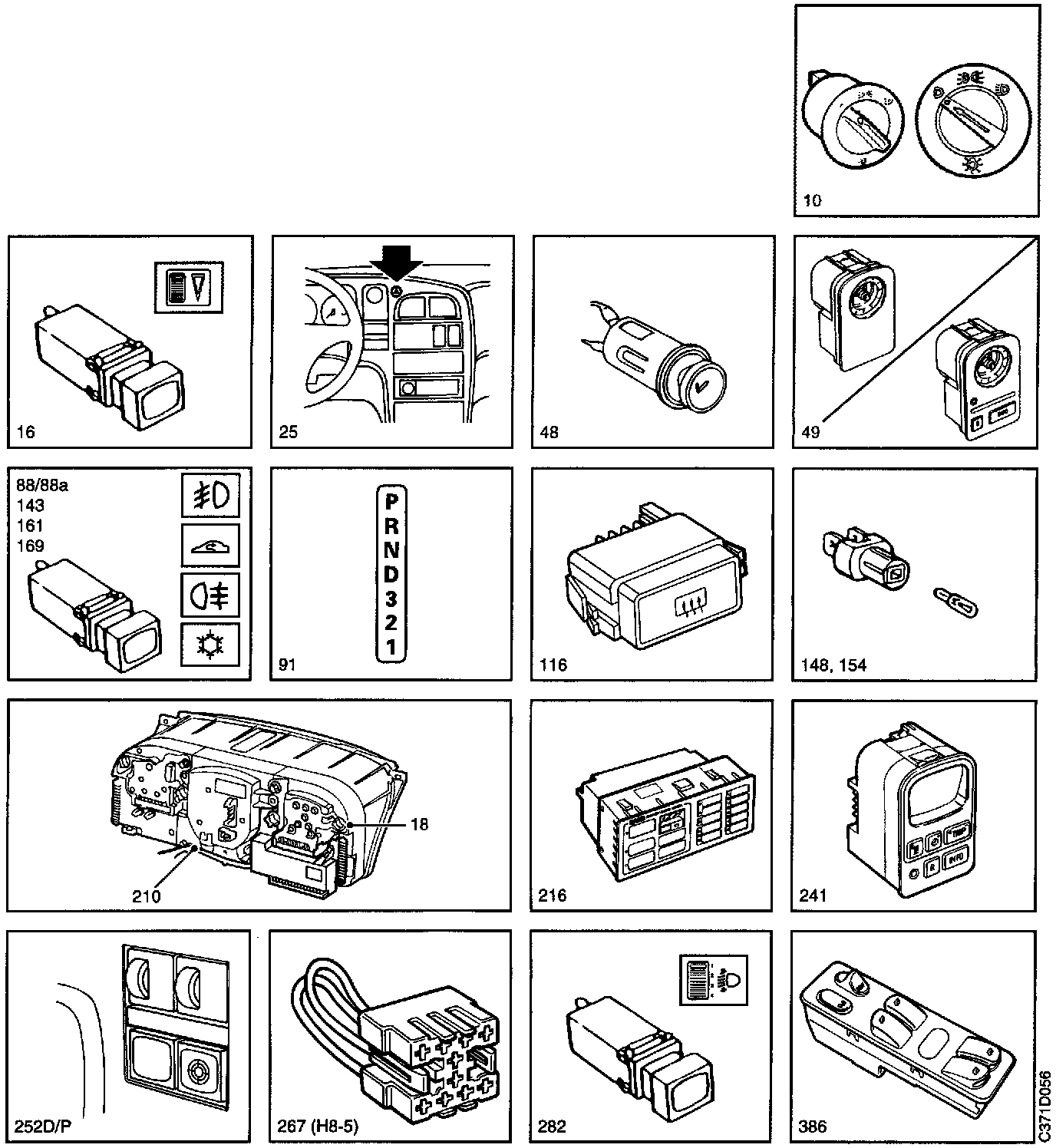 252P Rheostat, passenger's seat heating pad, on dashboard between the steering wheel and centre console.
