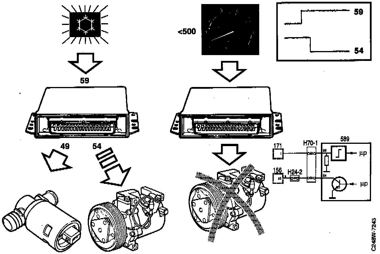 When the A/C compressor is activated, either from the ACC control module or by means of the A/C button on the dashboard, positive battery voltage (B+) is applied to pin 59 of the Trionic control module via the EDU, antifrost thermostat and pressure switch.