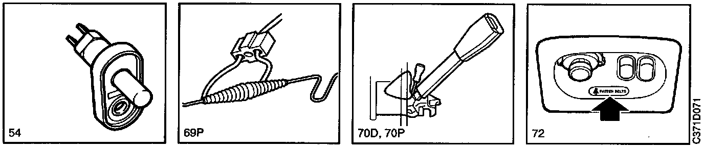 70P Seat-belt switch, passenger, between the driver and passenger seats.