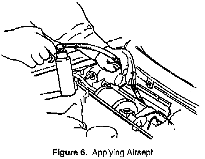 12. With an even motion, move the nozzle extension evenly across the evaporator housing, and spray 1/2 of the bottle of Airsept A/C treatment onto the leading edge of the evaporation See Figure 6.