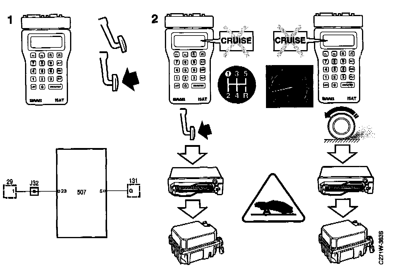 The car can be jacked up to activate the TCS function. If this method is used, proceed with extreme care. If only the front of the car is raised and supported on stands, the handbrake must always be applied and personnel should never stand in front of the car or beside the front wheels while the test is in progress. Speed should be restricted to the minimum possible above 4 km/h.