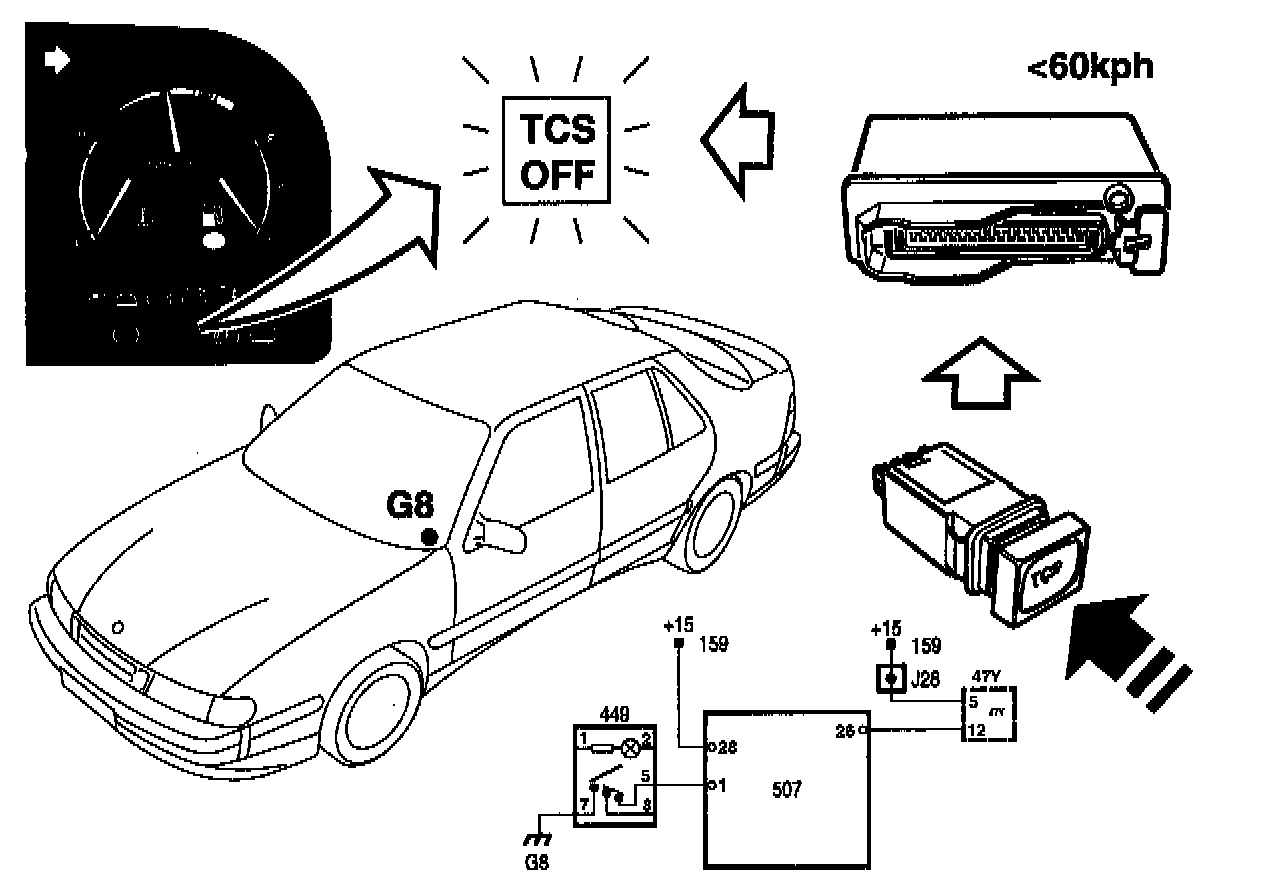 - The Traction Control System (TCS) switch has two connections, one to pin 1 in the control module and the other to ground. When the button is pressed in, the circuit is closed and the system engaged or disengaged depending on position. The TCS OFF lamp shows whether the system is engaged or disengaged.