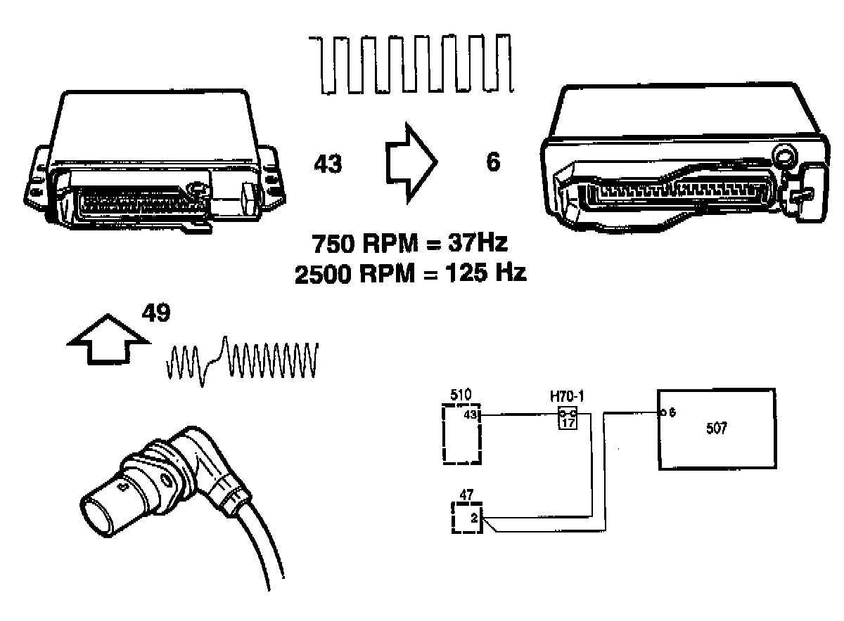 - The signal is a square wave of approx. 37 Hz while idling and approx. 125 Hz at 2500 rpm.