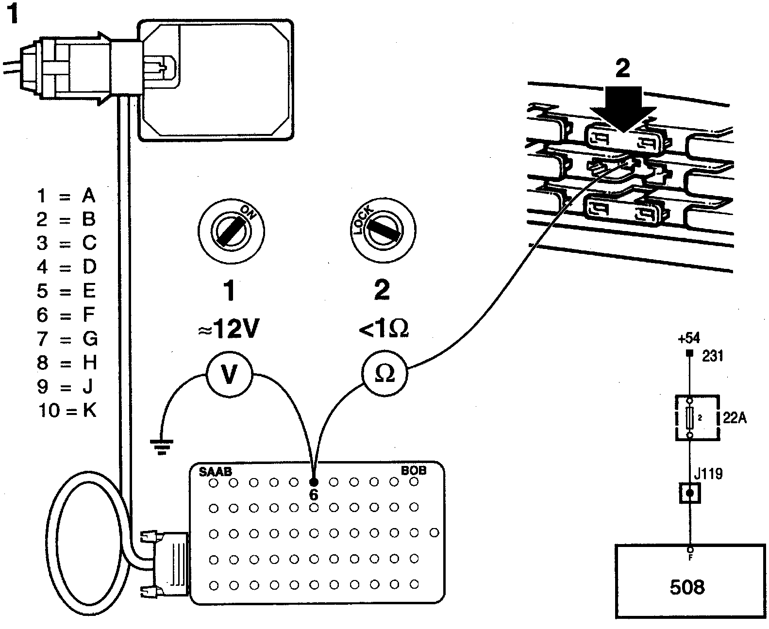 1 Ignition switch in the LOOK position. Connect a BOB and check the power supply for the Cruise Control system's control module by taking a voltage reading across pin F (6) of the control module connector and a good ground (e.g. a door hinge screw).