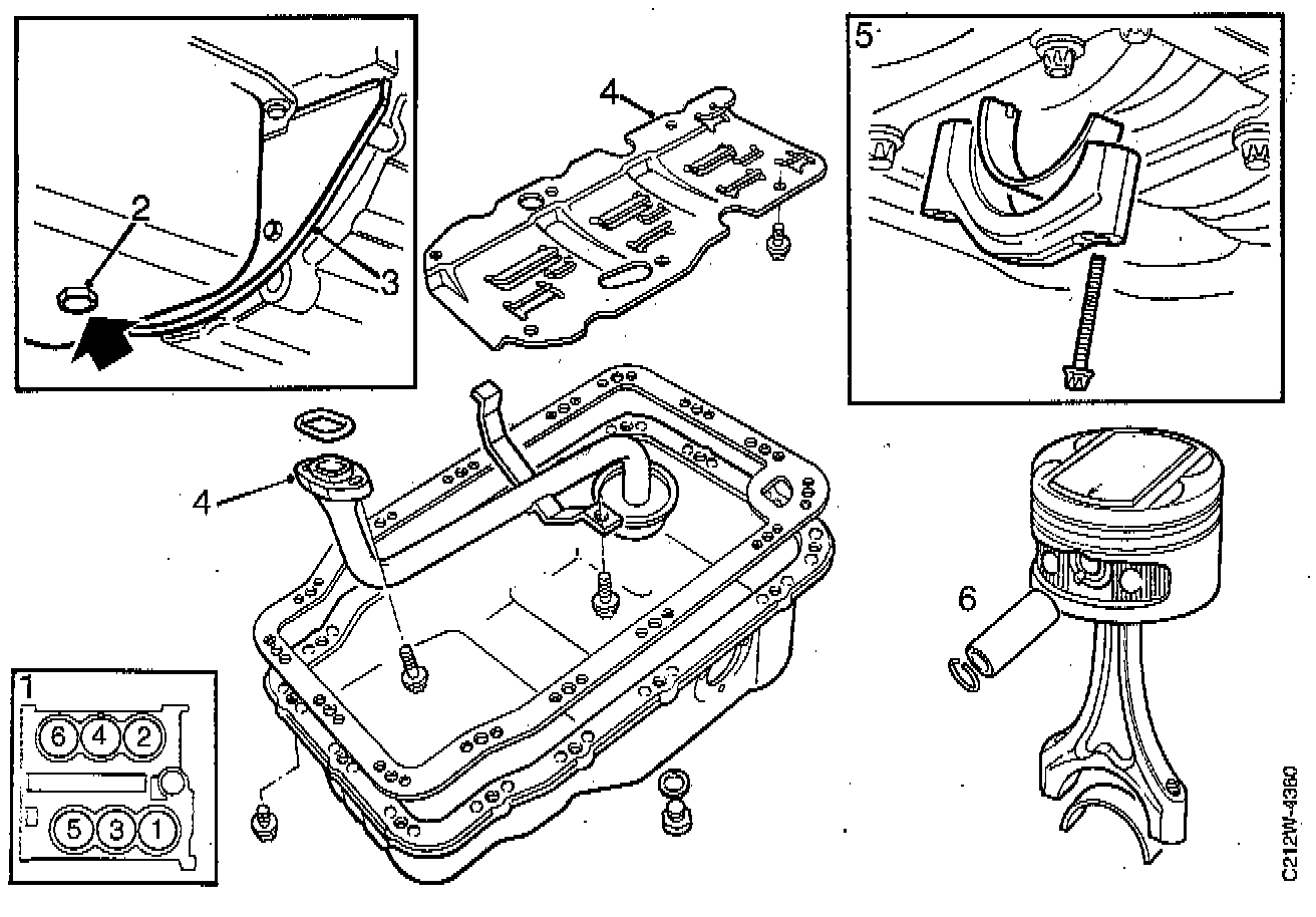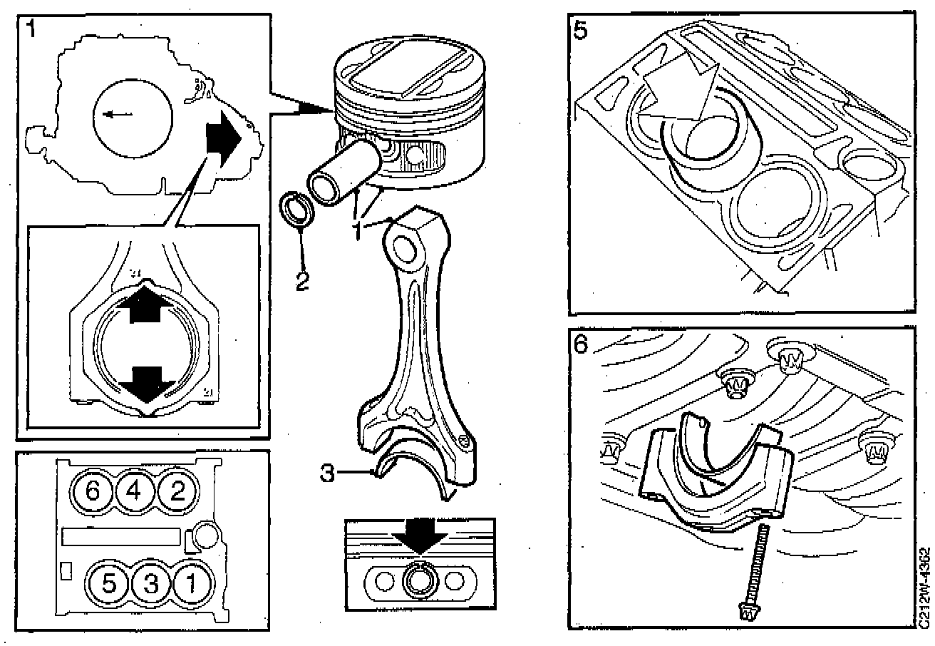 5. Mark the position and remove the appropriate connecting rod cap. Push the piston and the connecting rod out of the cylinder bore. Loosely install the bearing shells and the cap on the connecting rod.