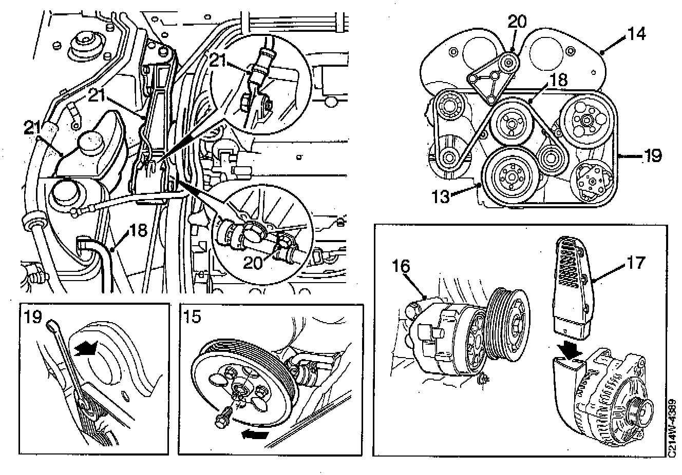19. Relieve the load from the belt tensioner by turning the belt tensioner pulley locking bolt forwards in the car using a 15 mm wrench. Install the belt on the coolant pump pulley and check the other pulleys. Carefully release the belt tensioner.