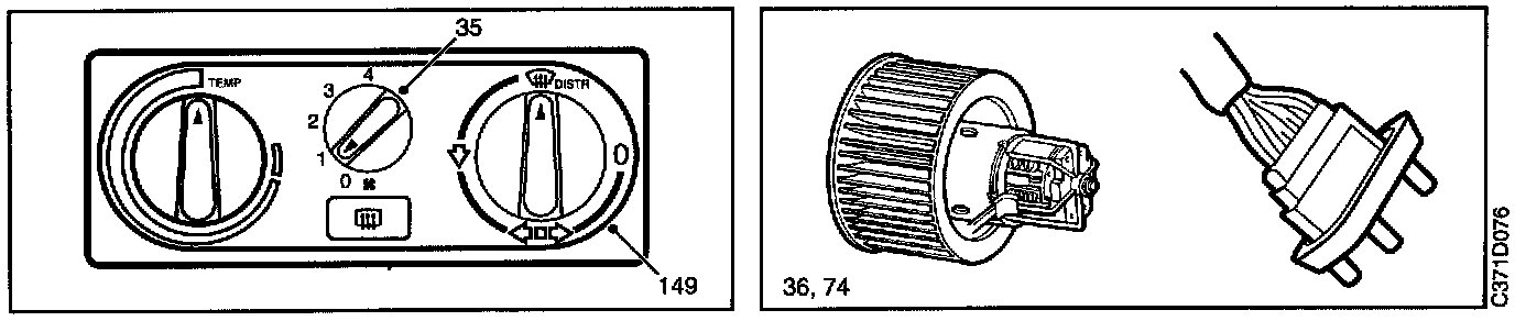 35 Switch, ventilation fan, on the control panel for heating and ventilation.