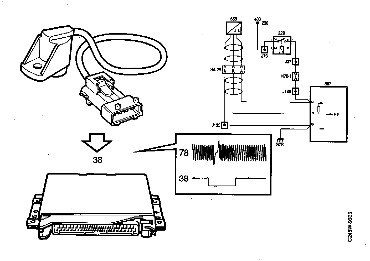 The exhaust camshaft sprocket has a hub with a ridge which passes the Hall-effect sensor once per camshaft revolution. The sensor output is connected to pin 38 of the control module.
