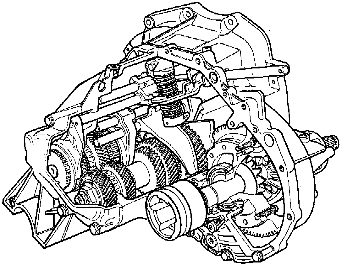 The manual gearbox is a five-speed gearbox. All gears (including reverse) are synchronized. The gearbox has relatively small rotating masses, and thus small moments of inertia to be braked at each gear change. This makes gear changing easy and smooth and interior wear on baulk rings and sleeves almost non-existent. The baulk rings are located on the input and output shafts.