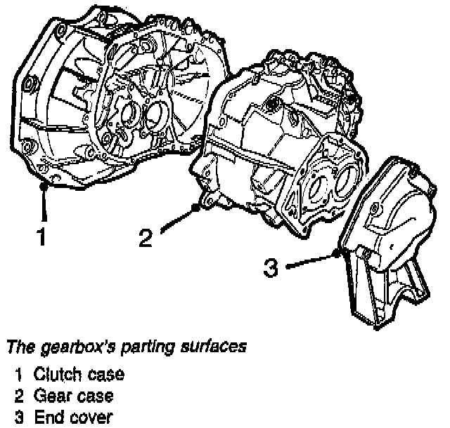 The gearbox has only two parting surfaces. The parting surface between clutch case and gear case is sealed with sealant and the parting surface between gear case and end cover is sealed with a gasket. Ventilation and de-airing are carried out through a "labyrinth" in the upper part of the gear case, in which there is also a filter (sintered plug) to keep out dirt and moisture.