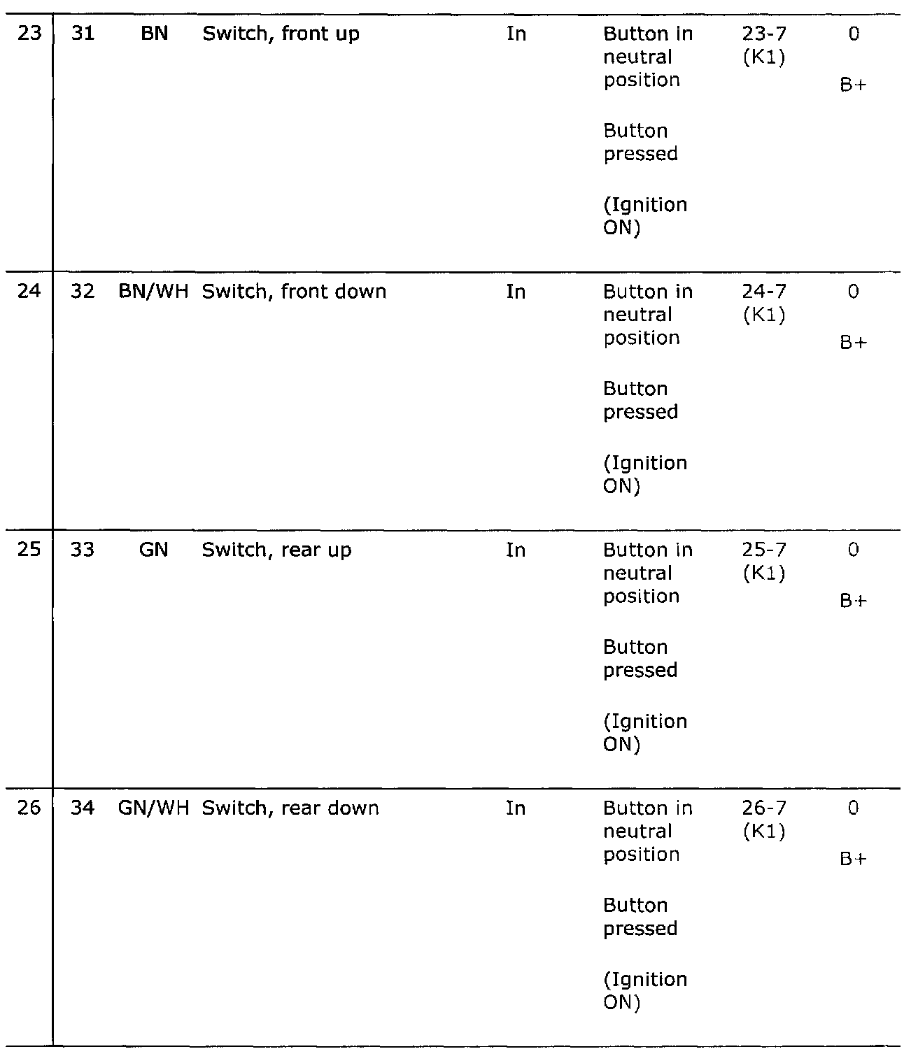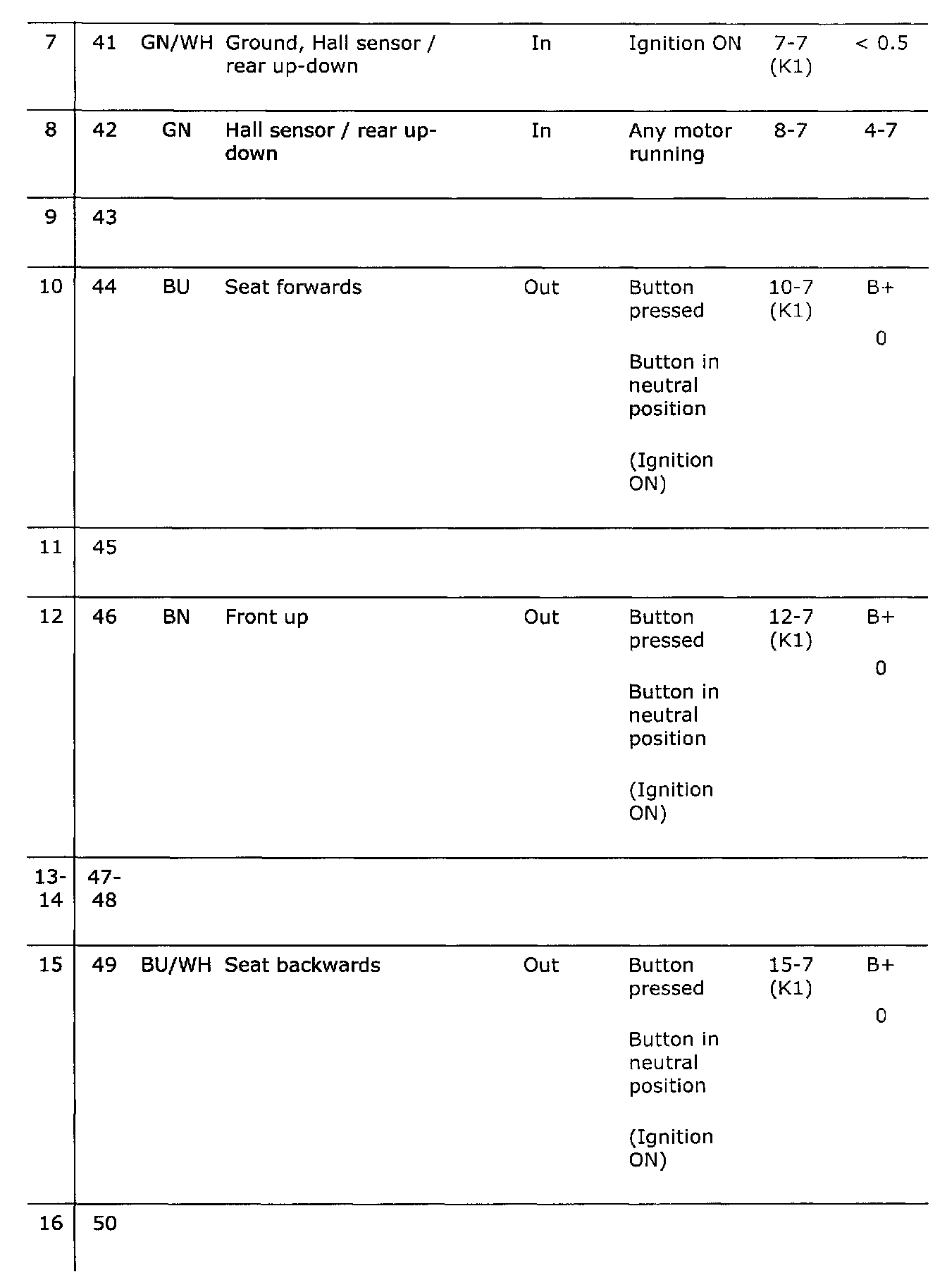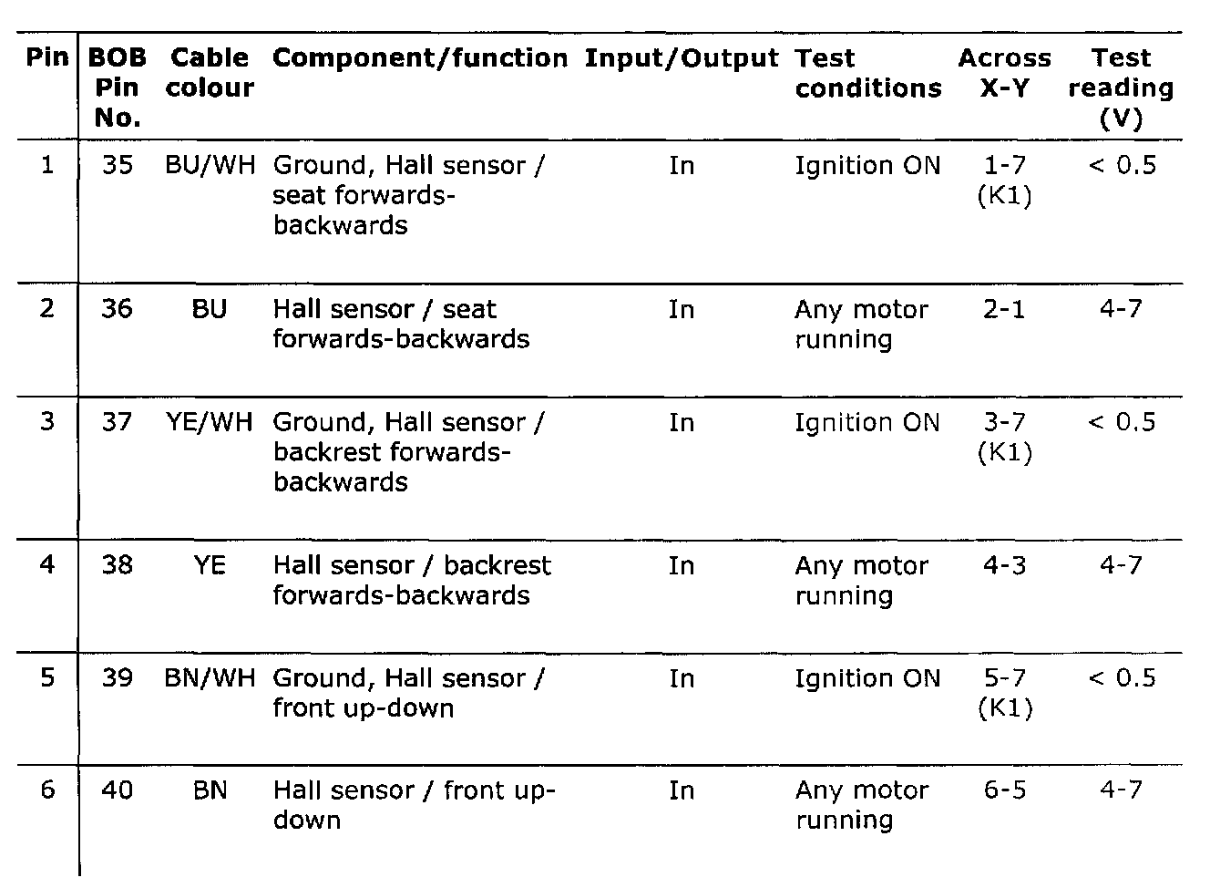 Connector 1 (K1), test readings