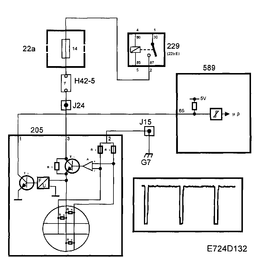 When the ignition switch is turned to the "ON" position, the main relay operates and B+ is supplied to pin 3 on the mass air flow sensor. A current passes RT and the low-ohmic Thermal resistors RH via R1 to ground. As the RH resistors are cold, Their resistance is low. The amplifier then sends a strong base current to transistor T1, whereby RH rapidly heat up. As RH heat up, the resistance increases and a state of equilibrium is achieved.