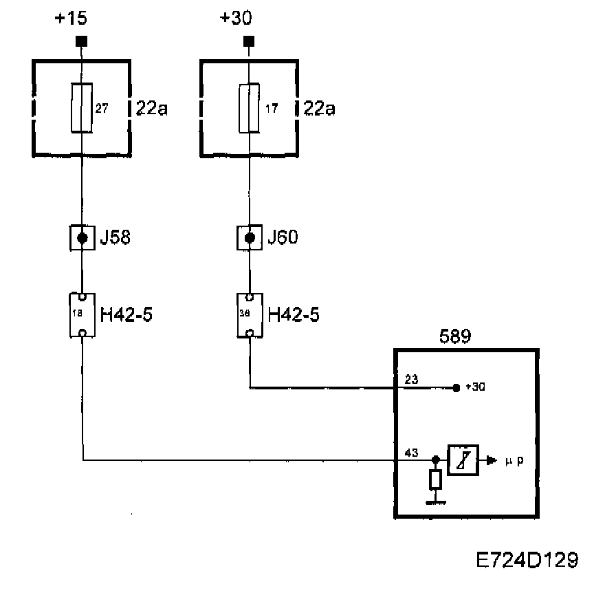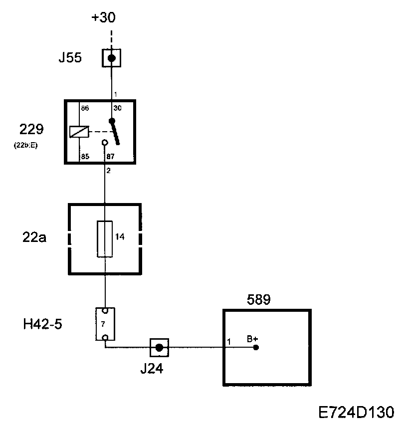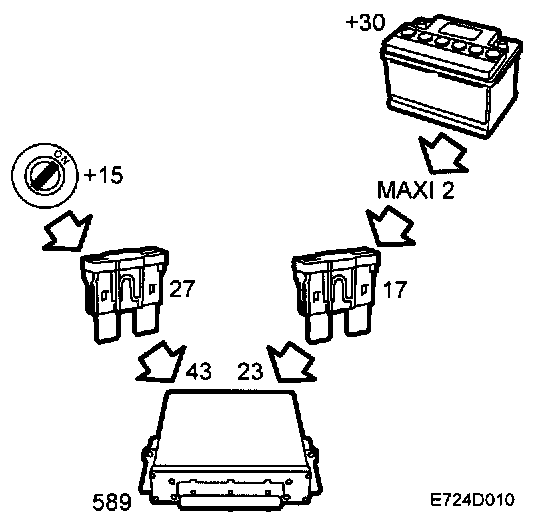 The main relay, Fuel pump relay and fuse 17 are supplied with +30 from maxi fuse 2. Control module pin 23 is supplied from fuse 17.
