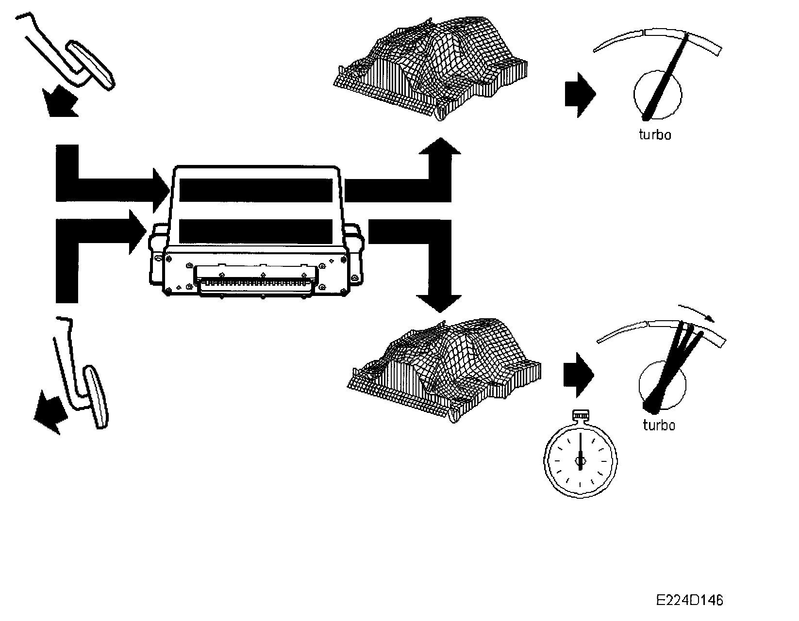 The overboost function enables the engine torque to be higher than the normal values programmed in the Trionic Control module memory. The normal value is max. 350 N.m in the speed range 1900-4000 rpm, but during powerful acceleration when the overboost function is activated, the Control module will change to another value that allows a higher max. torque (370 N.m in the same speed range). The overboost function gives an increase in torque in all speed ranges, although the increase is greatest in the range 1900-4000 rpm.