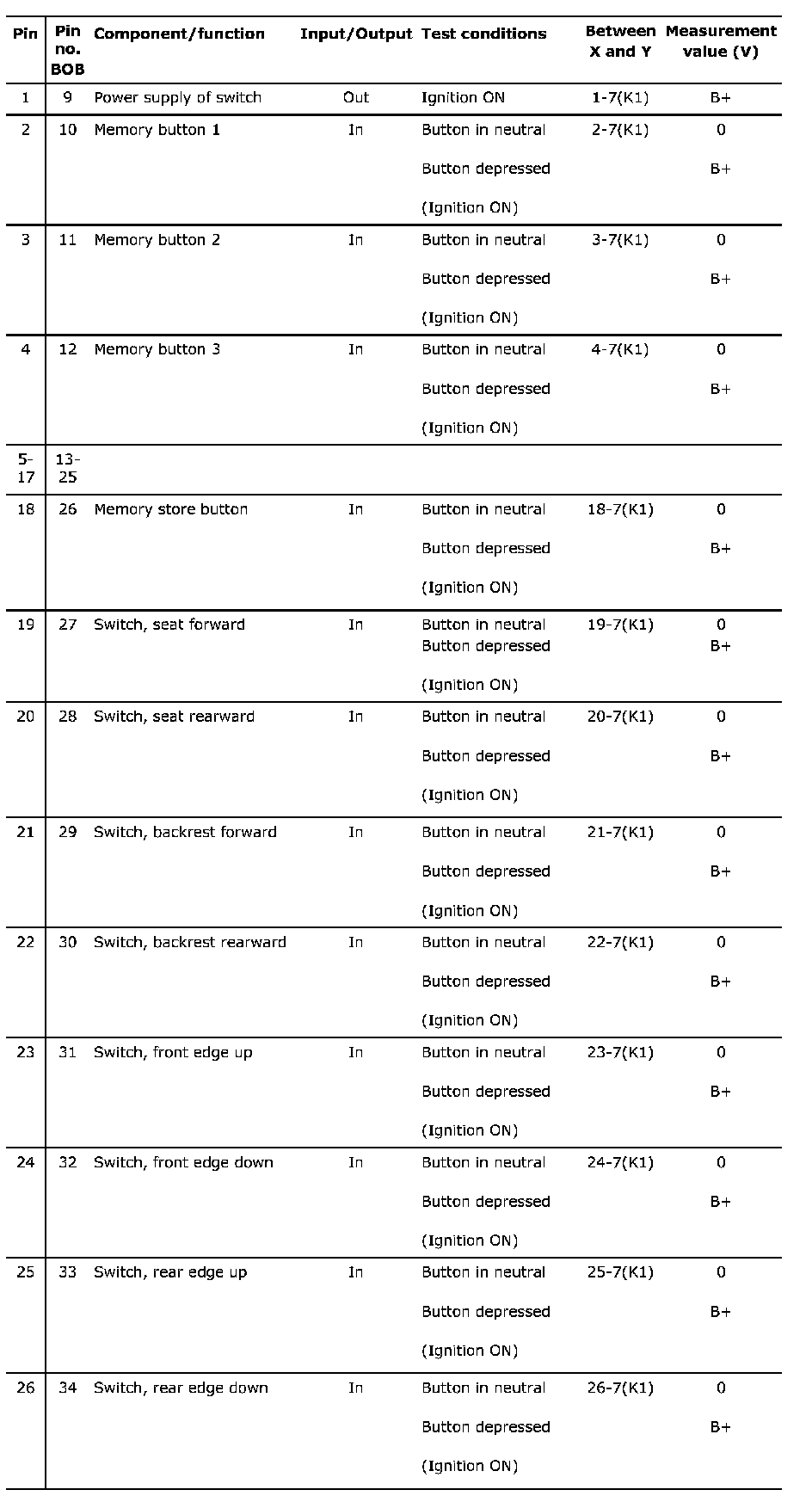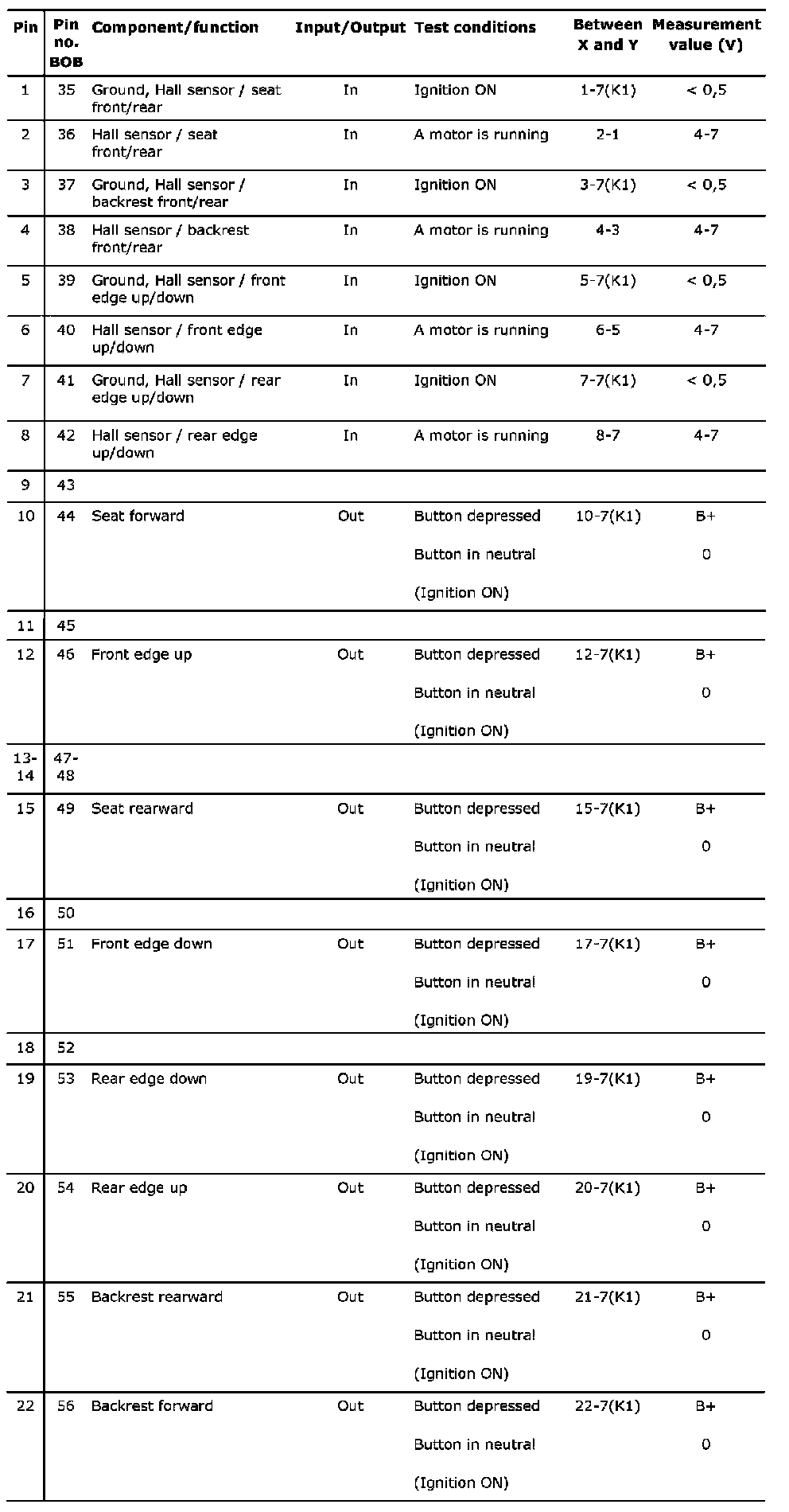 Connector 1 (K1), test readings