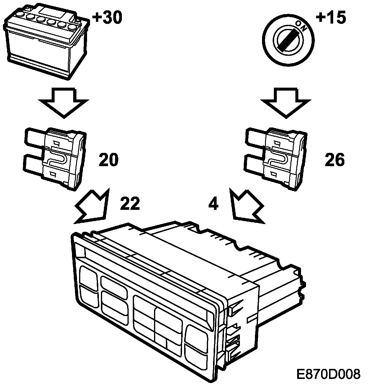 The ACC unit is supplied with current from the +30 circuit on pin 22 via fuse 20.