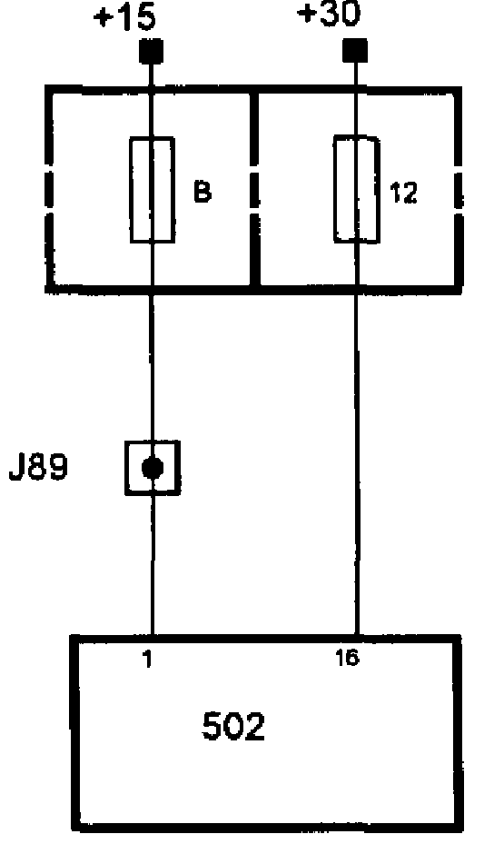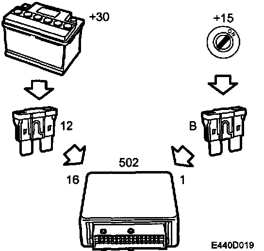 +30 current is fed via fuse 12 to control module pin 16. The control module uses +30 current for the bus function when the ignition is in position OFF (+15).