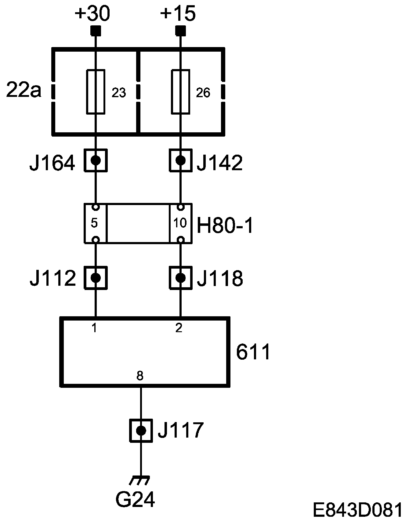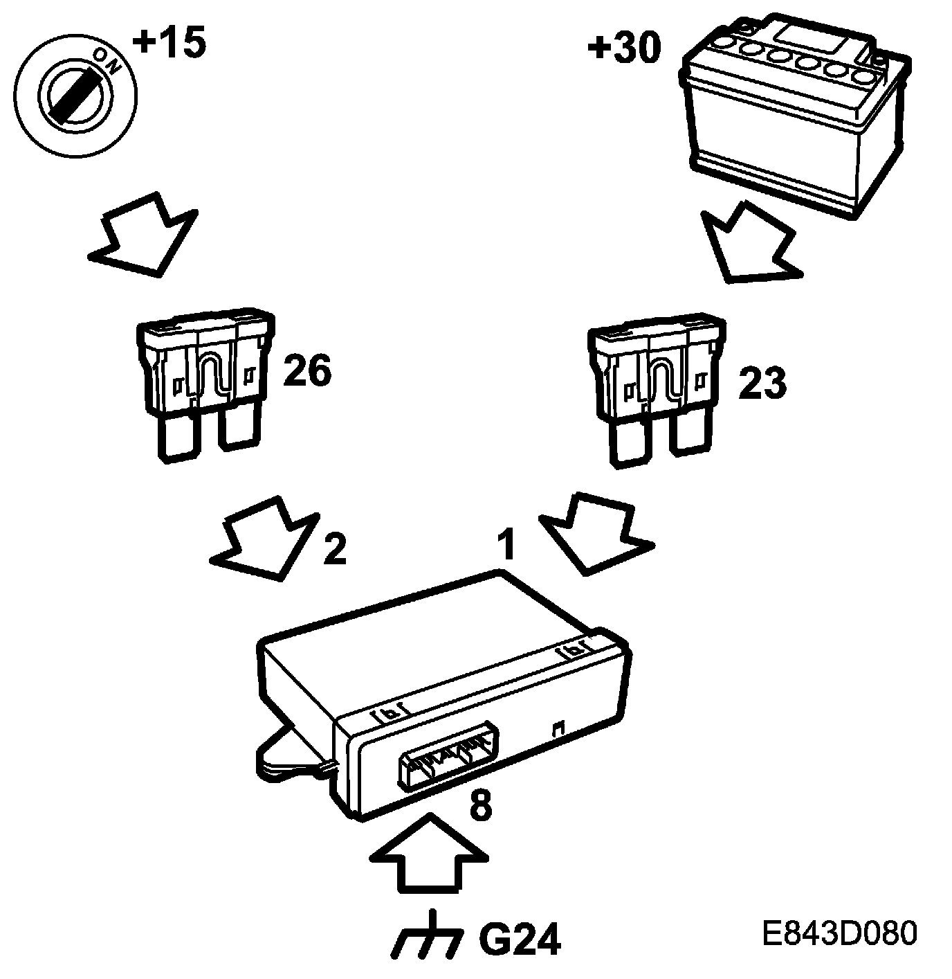 +15 power supply, fed via fuse 26 to control module pin 2.