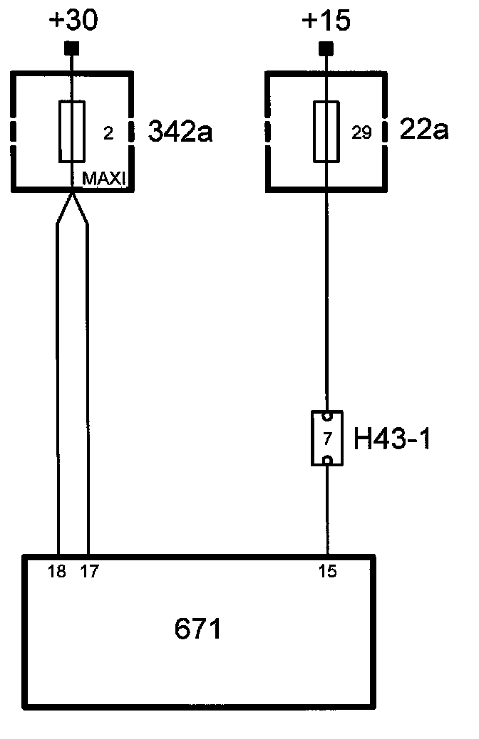 The +30-circuit power supply goes via fuse 1 (342a) to pins 17 and 18 on the control module.