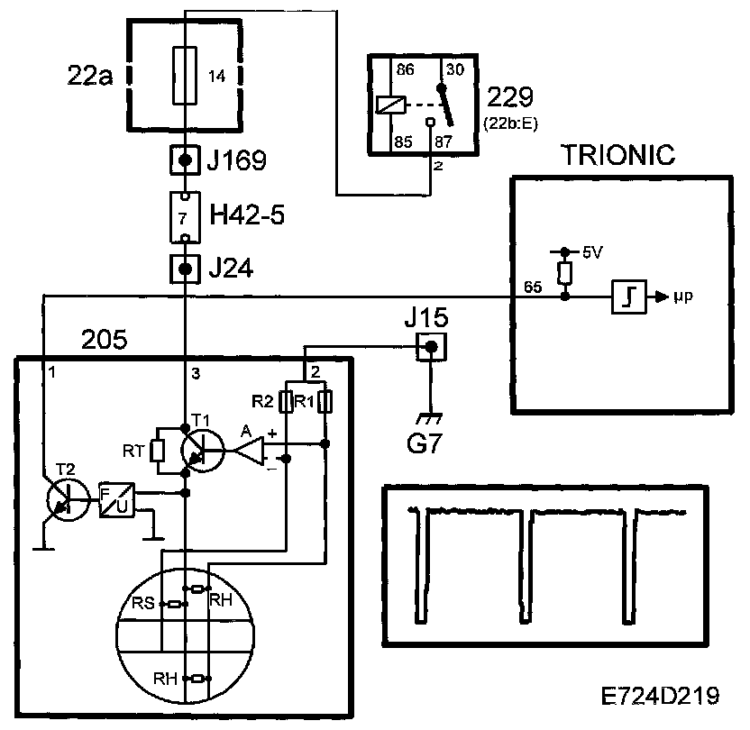 If RH are cooled by the airstream, their temperature will be reset immediately by an increase in current through transistor T1. The voltage required to keep the resistance of RH constant is fed to a frequency converter, which in turn controls transistor T2. T2 grounds the control module input with a frequency corresponding with the air mass flow. The ground pulses have a duration of 40 ms.