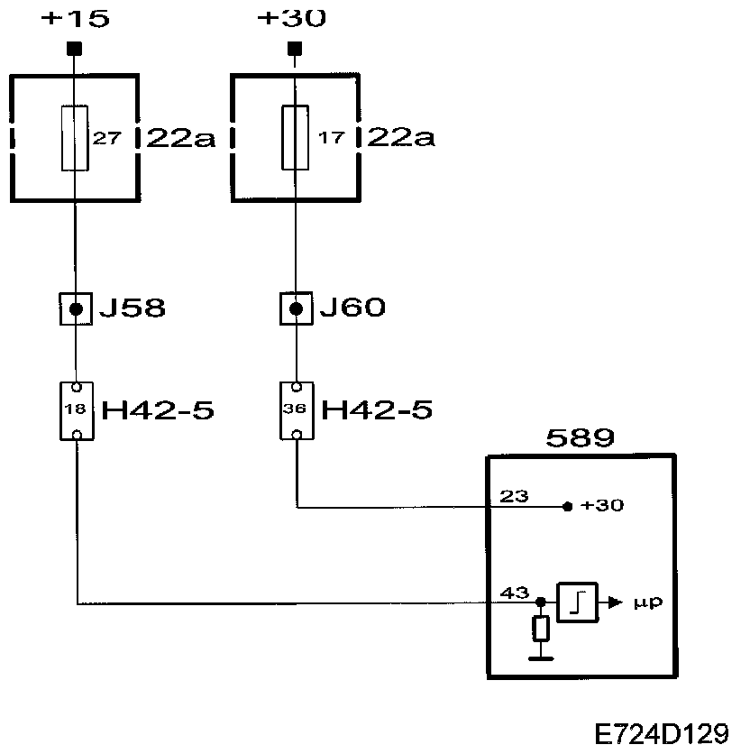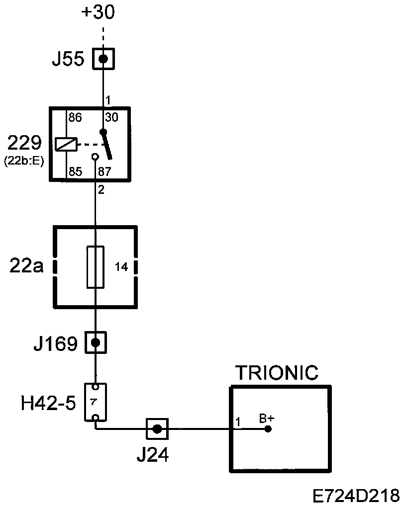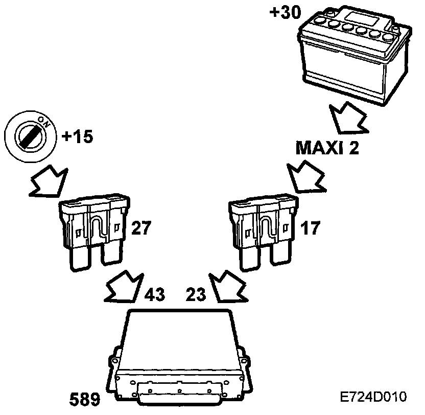 The main relay, fuel pump relay and fuse 17 are supplied with +30 from maxi fuse 2. Control module pin 23 is supplied from fuse 17.