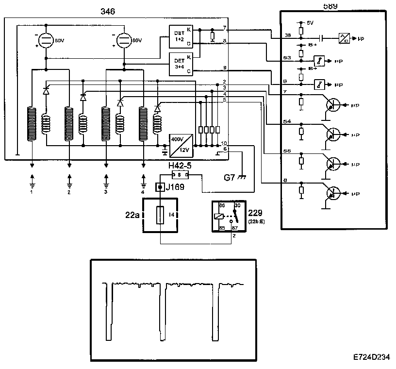 One of the poles on the secondary windings of the 4 ignition coils is connected to the respective spark plug as normal. The other pole is not grounded directly but is connected to 80 V. This means that 80 V is always present across the spark plug gap except just as the spark is produced.