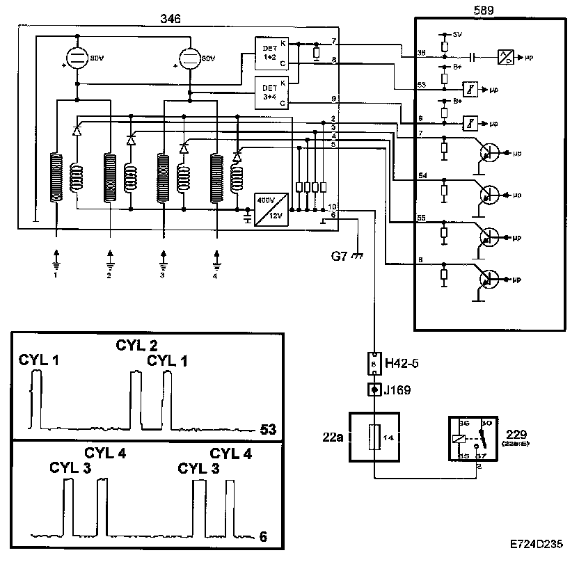 Two detectors measure the voltage drop across the cylinder pairs 1+2 and 3+4 respectively. If combustion takes place in cylinder 1 or 2, the ignition discharge module will send a B+ pulse to control module pin 53. In the same way, the ignition discharge module will send a B+ pulse to control module 6 if combustion takes place in cylinder 3 or 4.