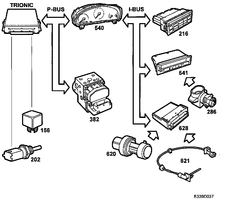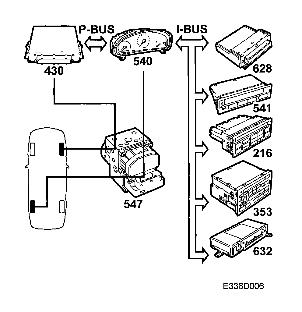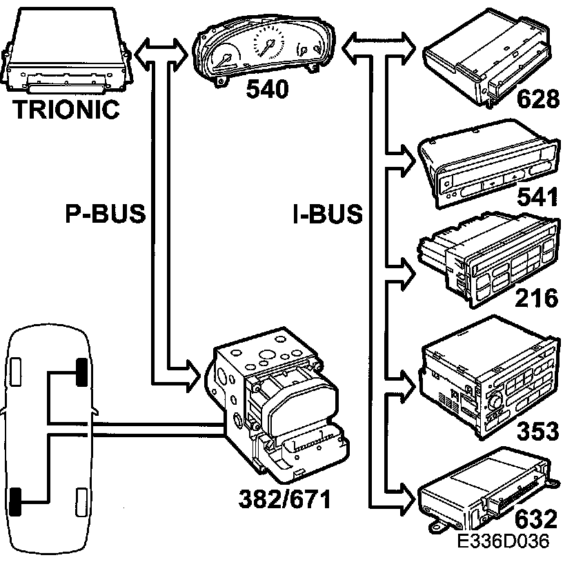 On cars with Traction Control or ESP, the TC/ABS or ESP control module is connected to the P-bus. The TC/ABS or ESP control module sends out wheel speed for all four wheels, but the other systems only use information on the speed of the LH rear and RH front wheels.