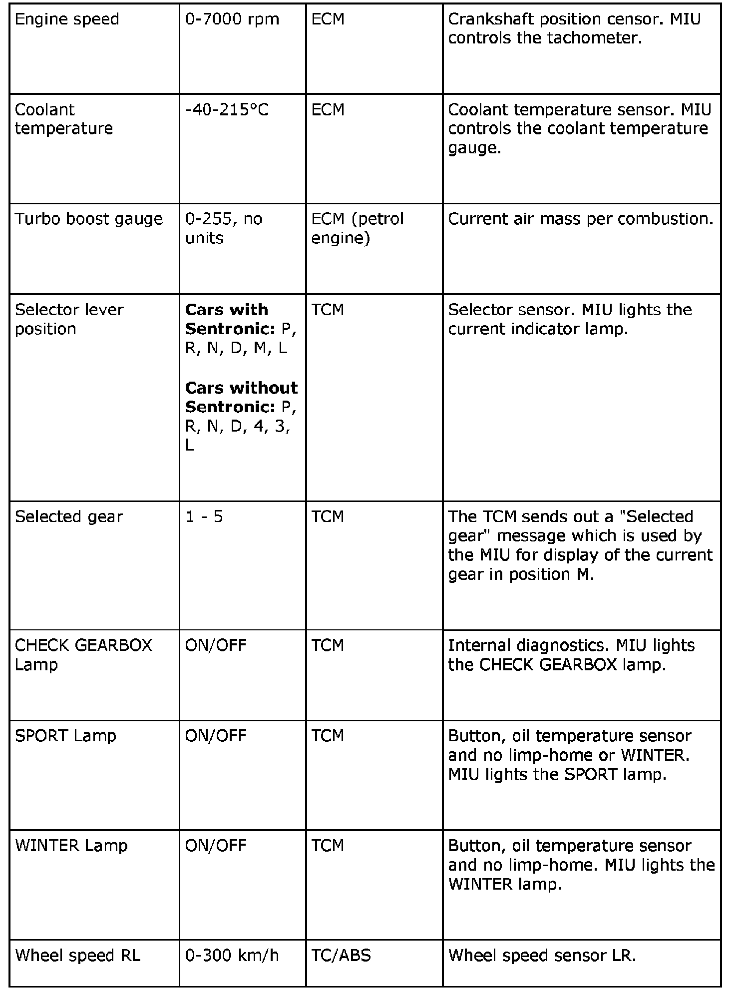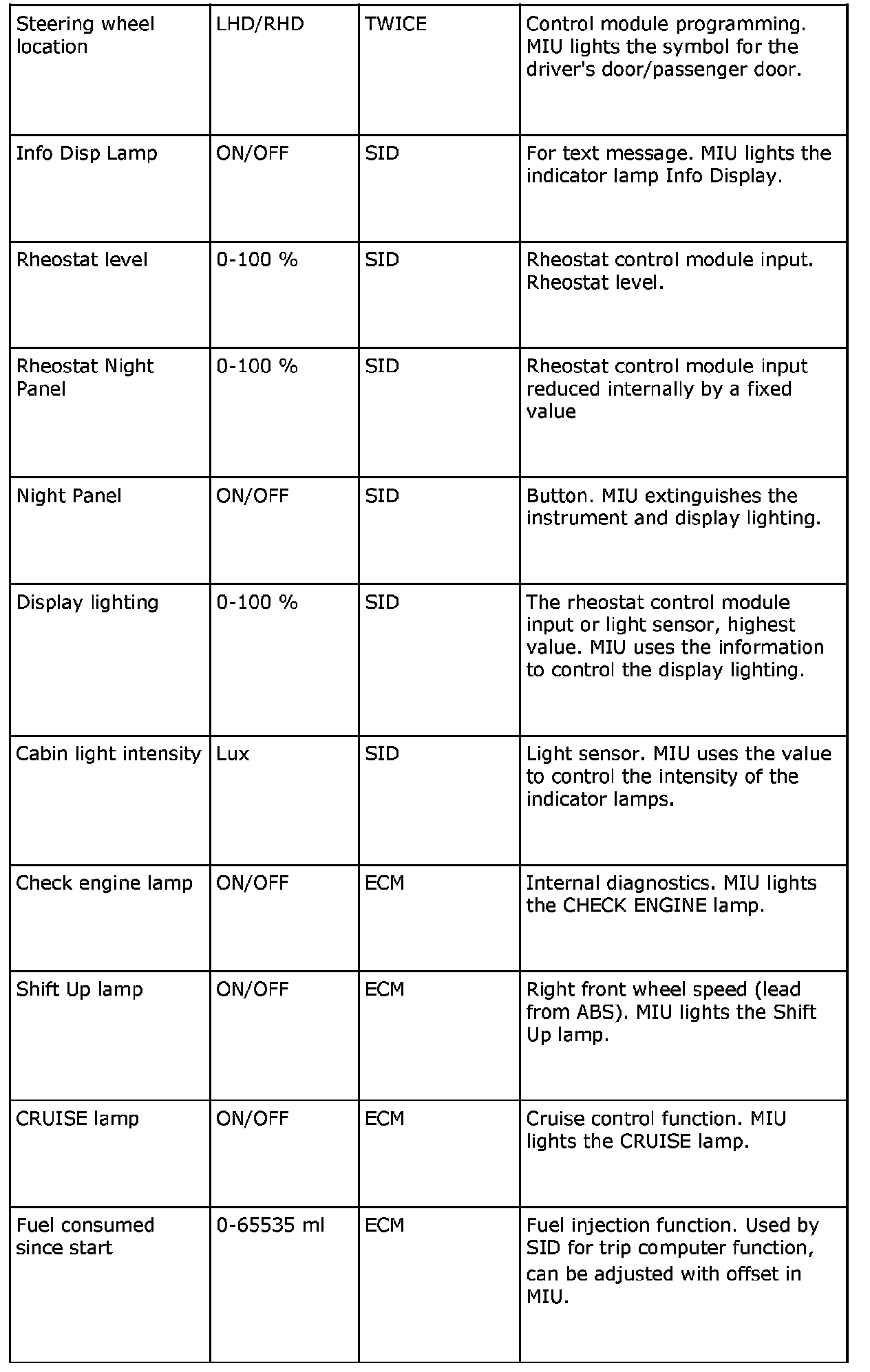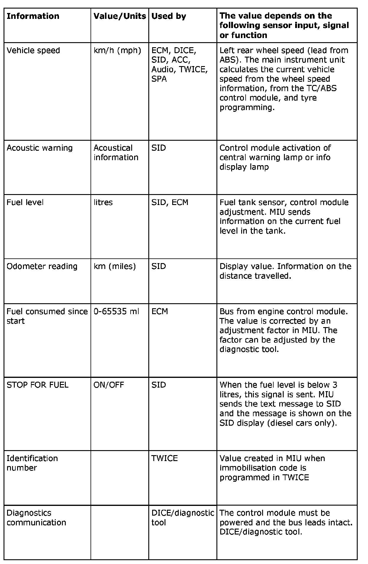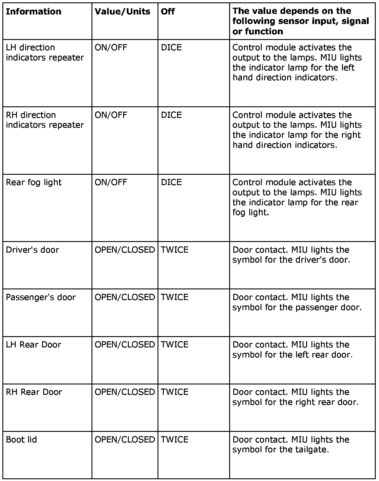 The MIU sends the following information: