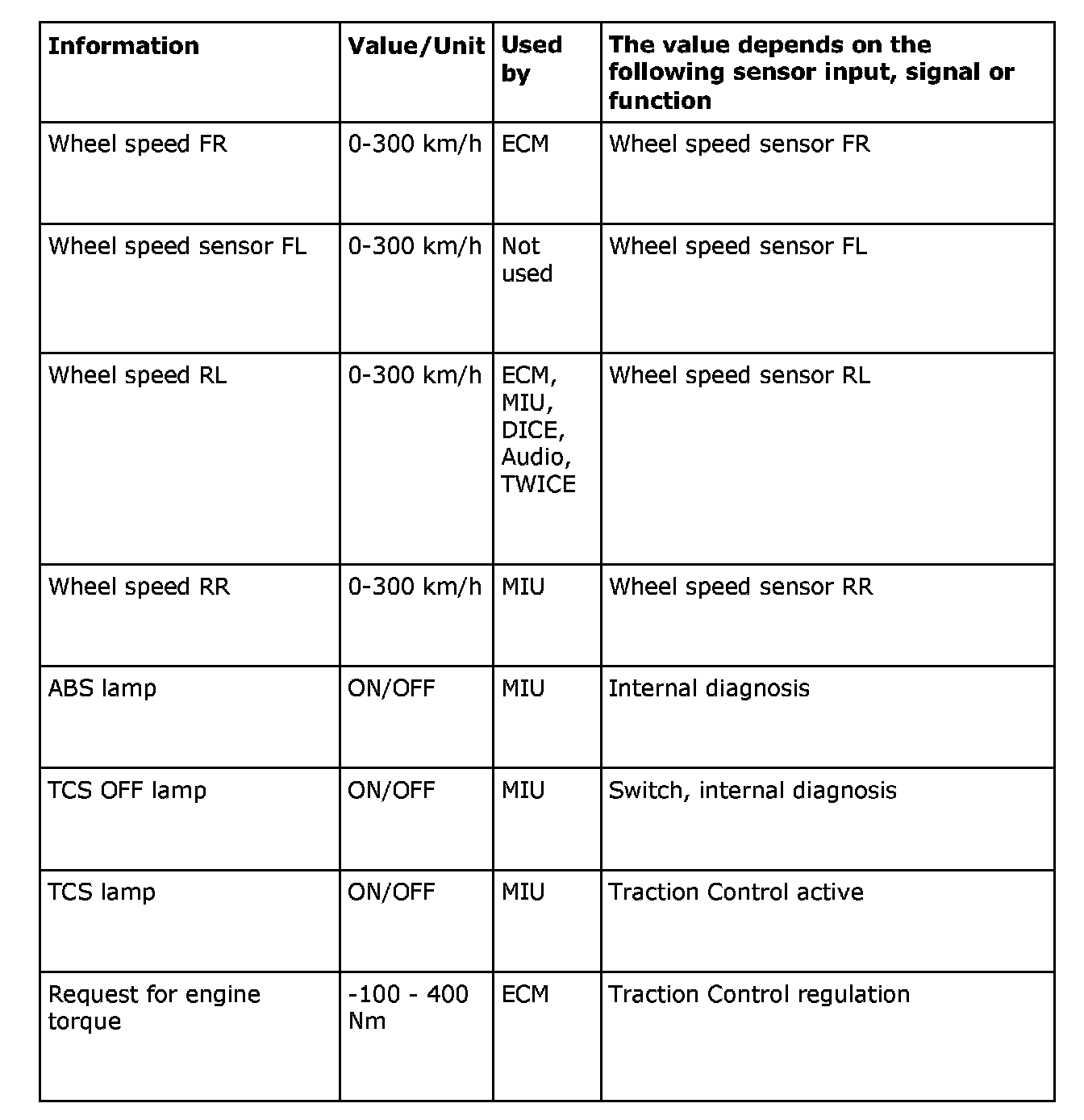 TC/ABS sends the following information: