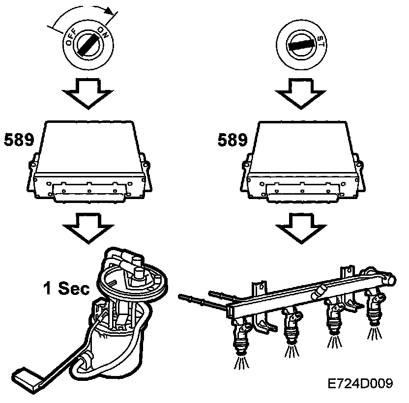 When the ignition is switched on, the control module will be activated and the CHECK ENGINE lamp will go on continuously as a function check. The fuel pump is activated for 1 second so that fuel pressure will build up, after which the control module will await pulses from the crankshaft position sensor.