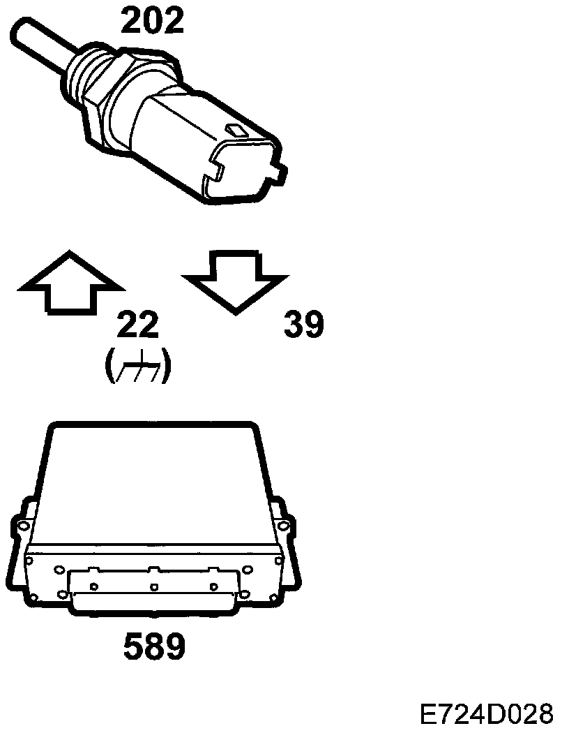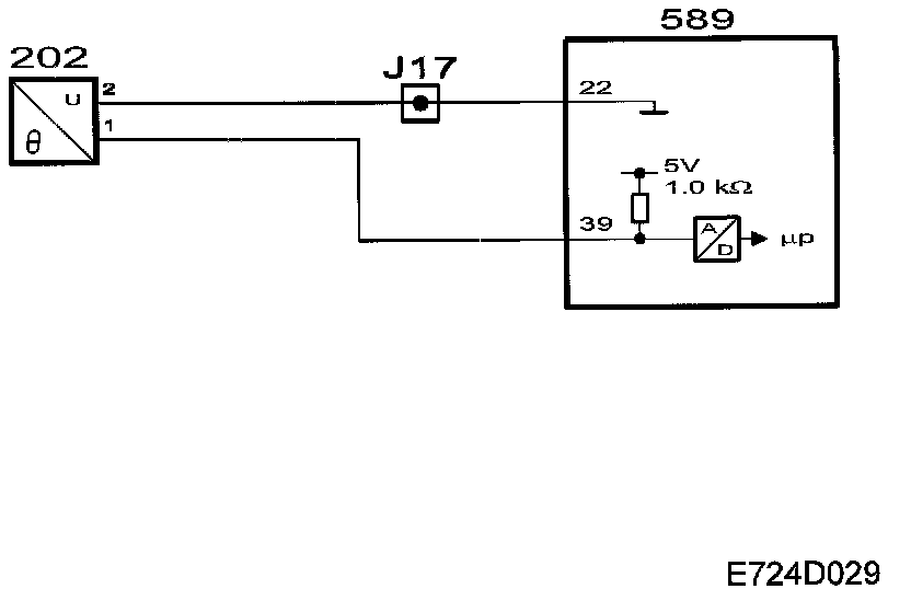 The control module measures the engine coolant temperature by supplying the sensor with 5 V through and integrated 1.0 kohm resistor from pin 39. The sensor is grounded via control module pin 22. The voltage across the resistor in the control module is proportional to the engine coolant temperature.