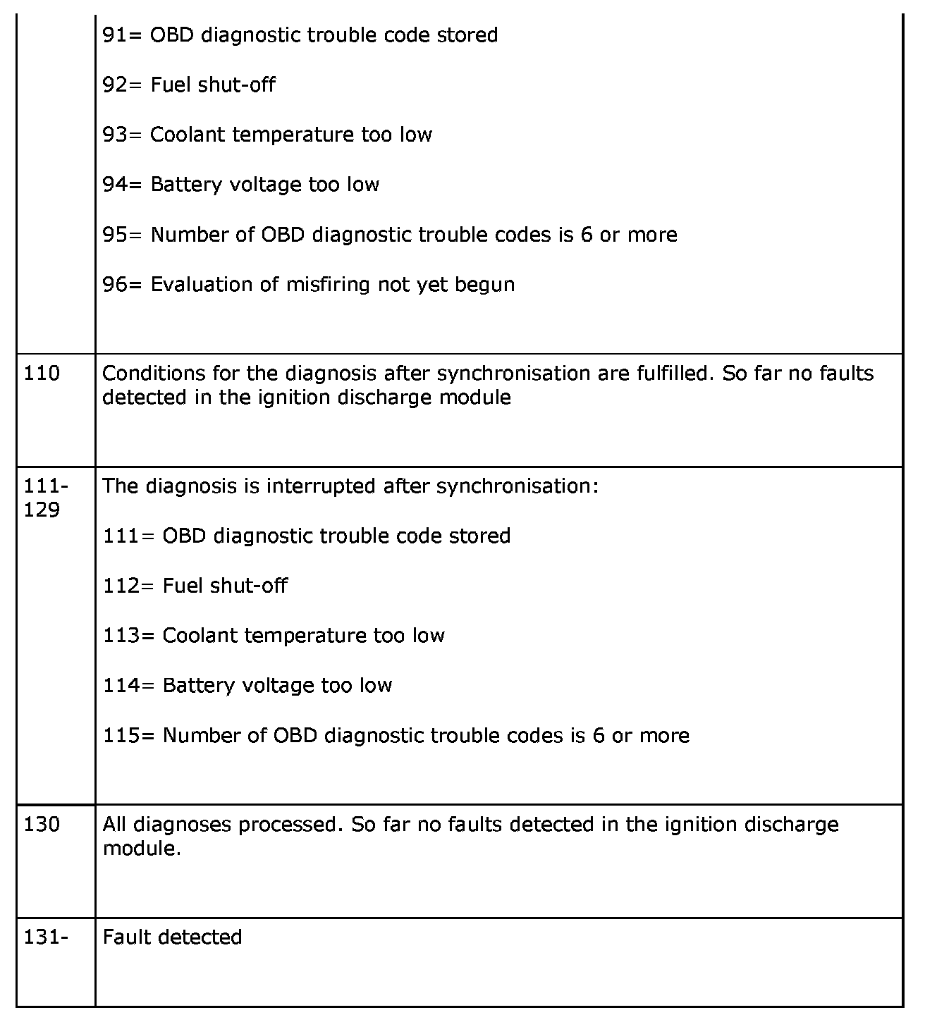 A number is displayed here which indicates which stage the diagnostic procedure is in. If the number is 130 or lower then no fault has yet been detected in the ignition discharge module.