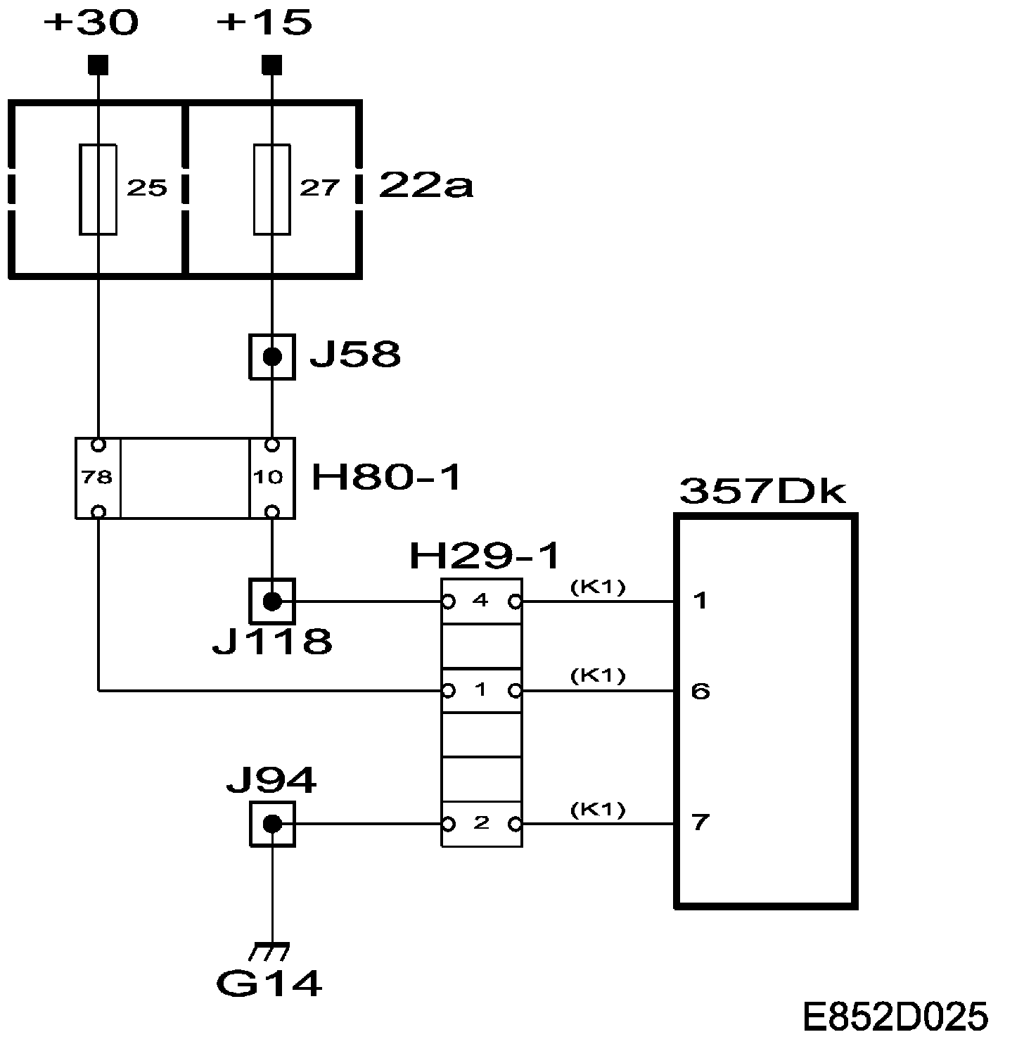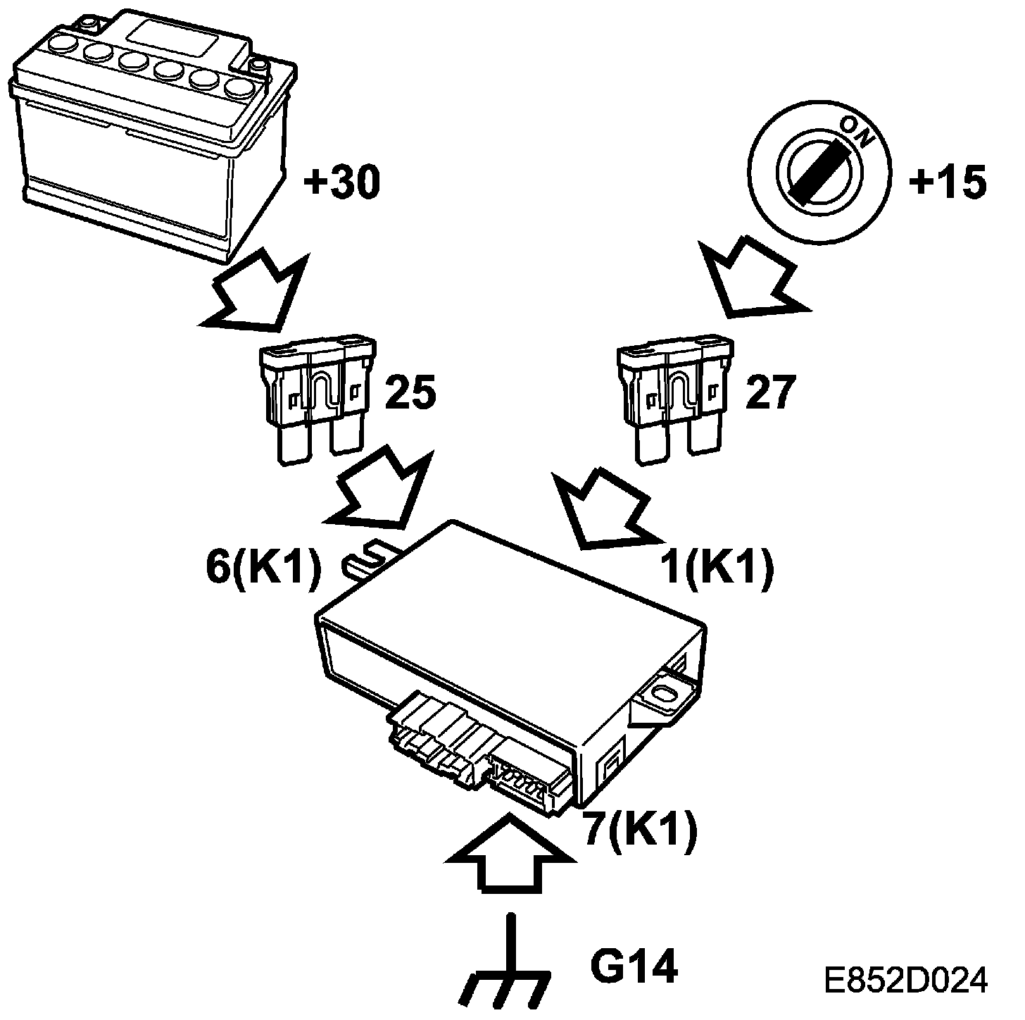 Power +30 is supplied via fuse 25 to control module pin 6.
