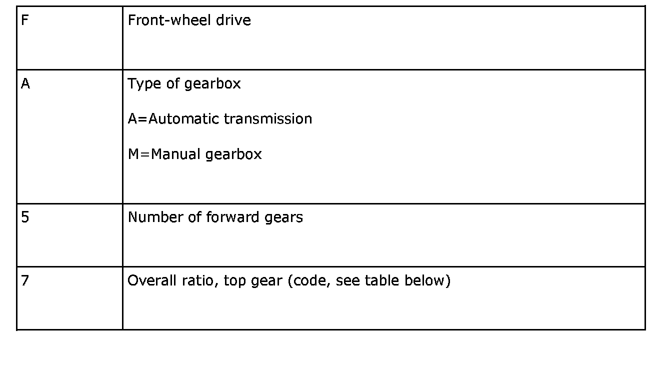The type designation of an automatic transmission consists of 3 groups of characters as shown below: