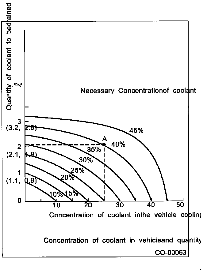^ Assume that the coolant concentration must be increased from 25% to 40%. Find point A, where the 25% line of coolant concentration intersects with the 40% curve of the necessary coolant concentration, and read the scale on the vertical axis of the graph at height A. The quantity of coolant to be drained is 2.1 liters (2.2 US qt, 1.8 Imp qt). Drain 2.1 liters (2.2 US qt, 1.8 Imp qt) of coolant from the cooling system and add 2.1 liters (2.2 US qt, 1.8 Imp qt) of the undiluted solution of coolant.