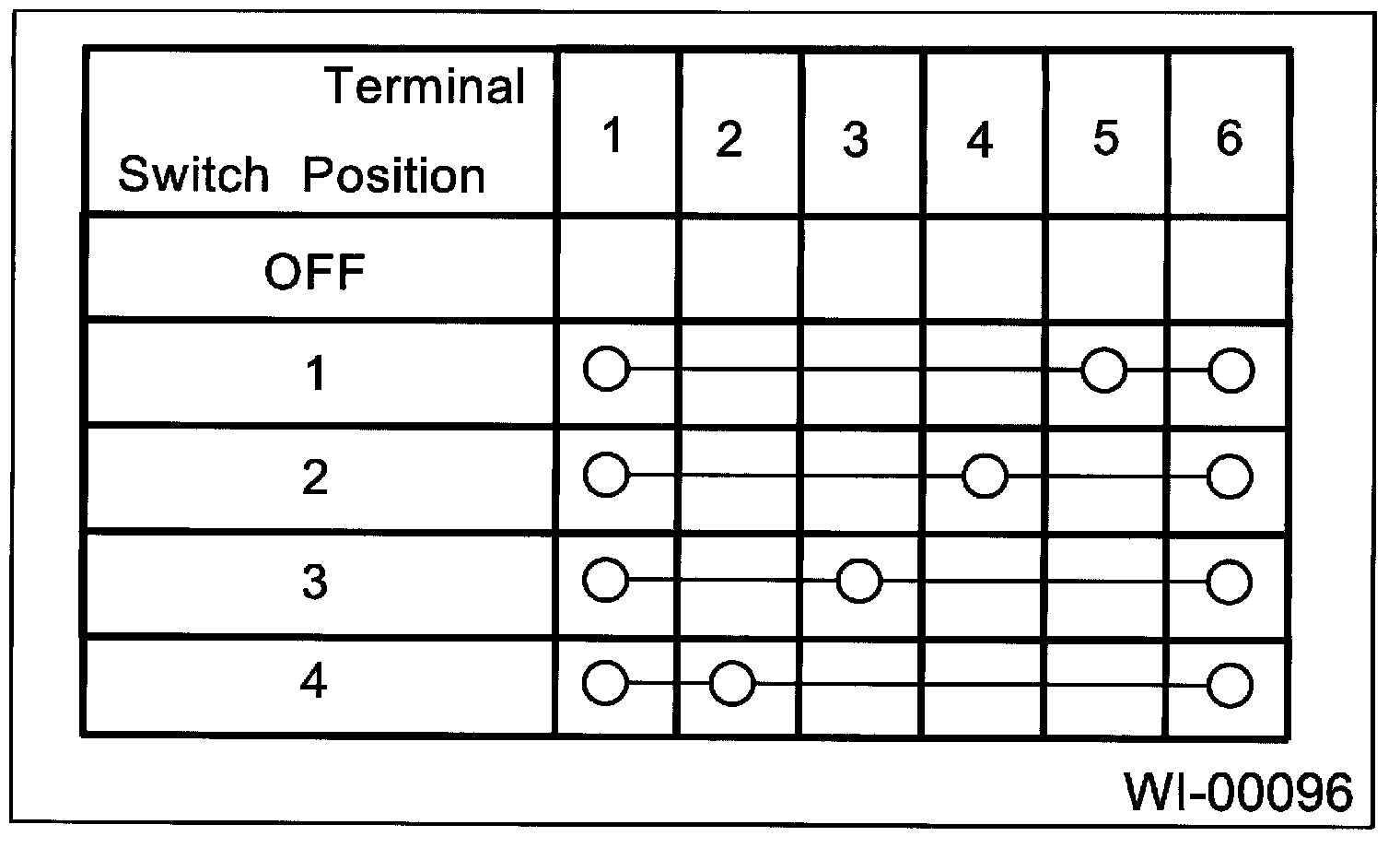 Symbol "O-O" indicates that continuity exists between two points or terminals. For example, when a switch position is at "3", continuity exists among terminals 1, 3 and 6, as shown in table.
