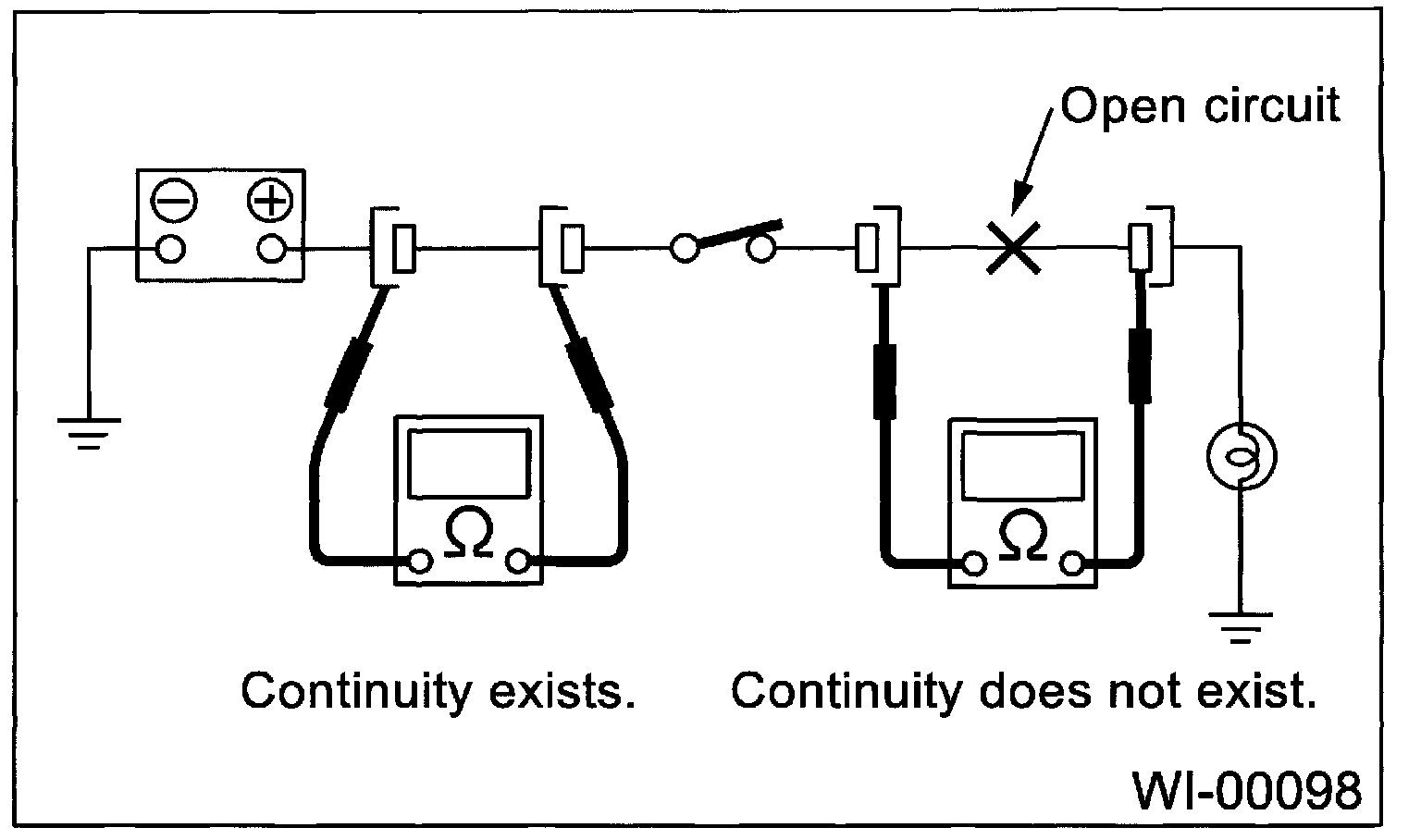 Disconnect all connectors affected, and check the continuity in wiring between adjacent connectors. When the ohmmeter indicates "infinite", the wiring is open.