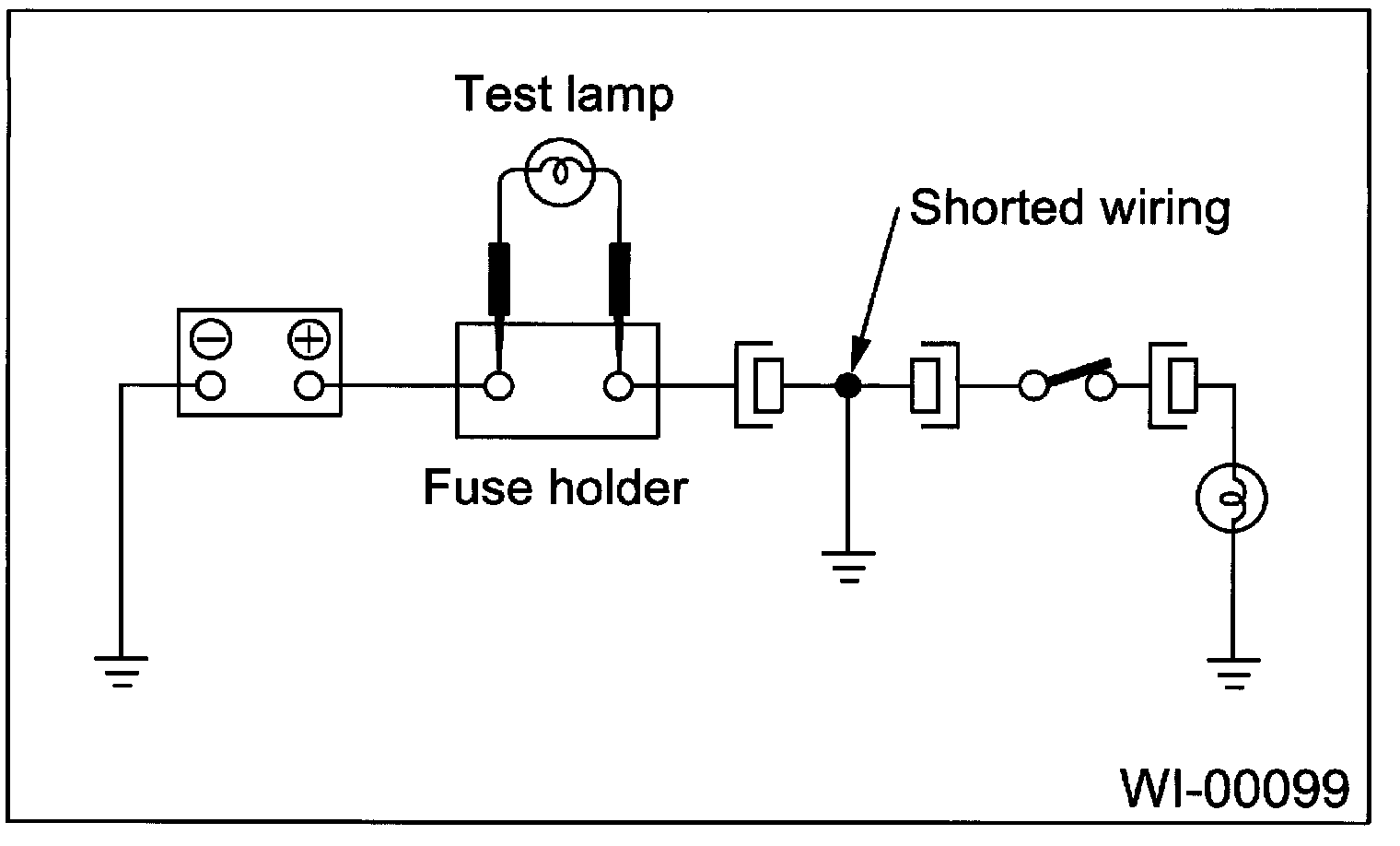 Connect a test light (rated at approx. 3 watts) in place of the blown fuse and allow current to flow through the circuit. Disconnect one connector at a time from the circuit, starting with the one located farthest from power supply. If the test light goes out when a connector is disconnected, the wiring between that connector and next connector (farther from the power supply) is shorted.