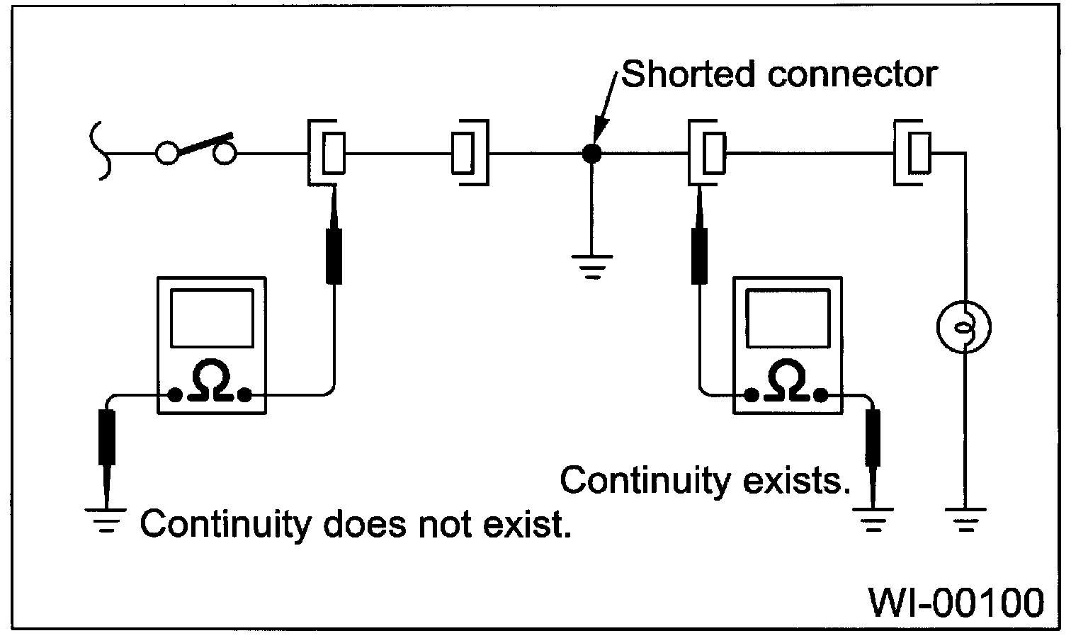 Disconnect all affected connectors, and check the continuity between each connector and ground. When the ohmmeter indicates continuity between a particular connector and a ground, that the connector is shorted.