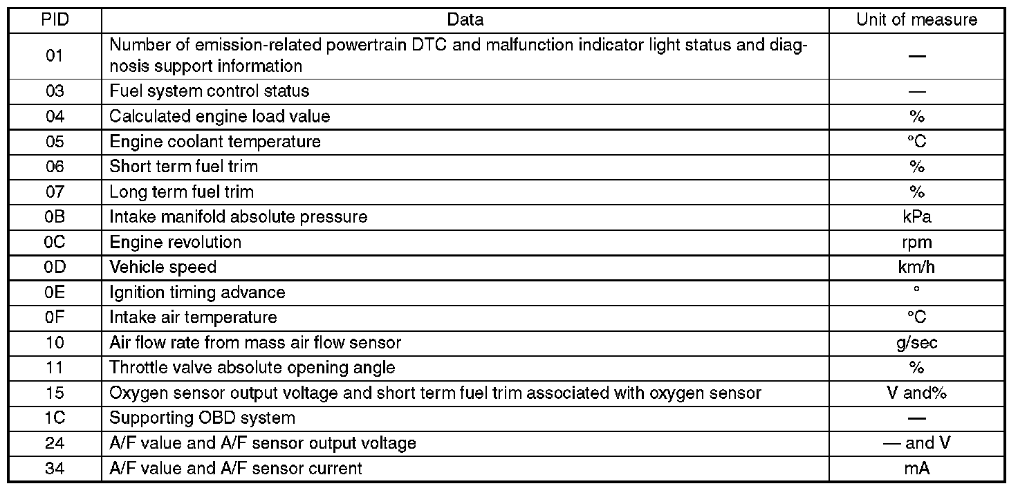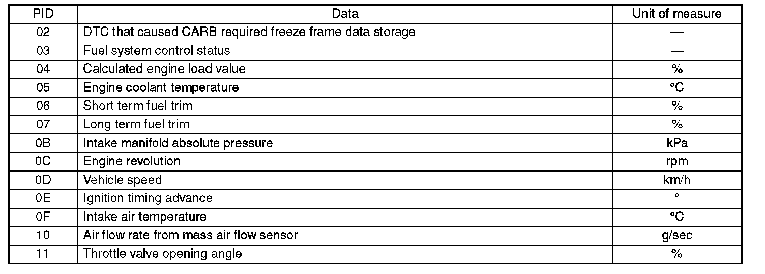 Refers to data denoting the operating condition when trouble is sensed by the on-board diagnosis system. A list of the support data and PID (Parameter Identification) codes are shown in the above table.