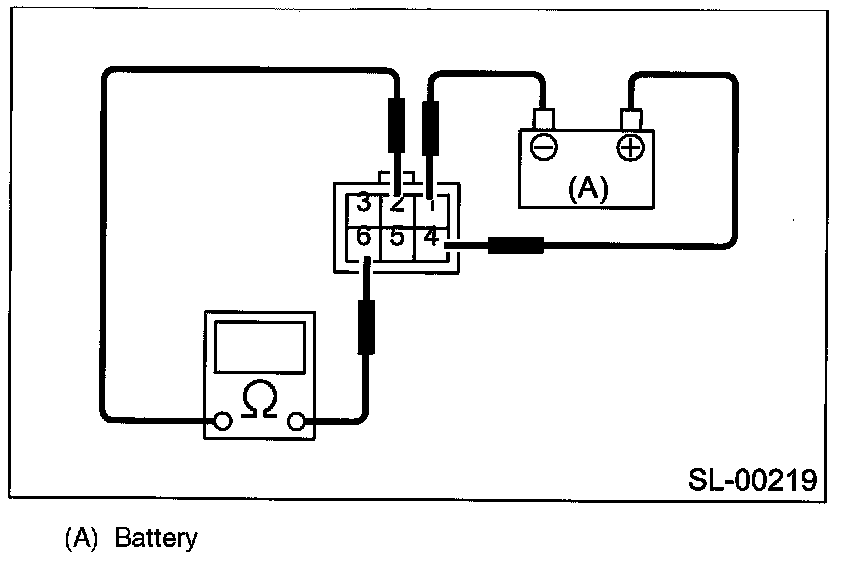 Measure the interrupt relay resistance between terminals (indicated in the table) when connecting terminal No. 4 to battery positive terminal and terminal No. 1 to battery ground terminal.